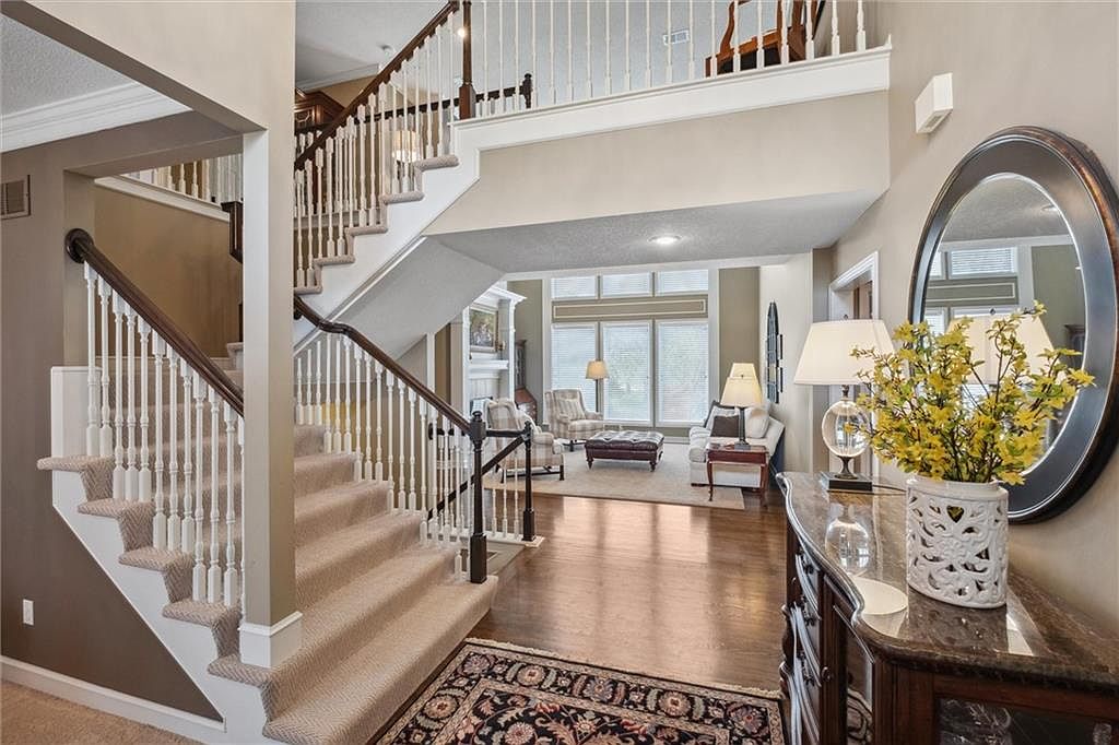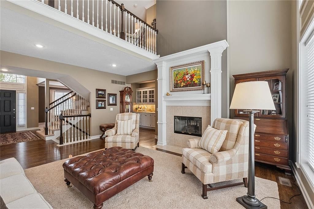 This stunning home is situated in the sought-after golf course community of Falcon Ridge in Lenexa, KS. Exhibiting a charming blend of traditional and contemporary architectural styles, the exterior features a mix of textured stonework and smooth stucco with elegant gables and large windows, creating an inviting and sophisticated curb appeal. The well-manicured lawn and mature landscaping complement the stately façade, including a spacious three-car garage. The upper level comprises three large bedrooms with ample closet space, ideal for family or guests. The finished walk-out basement enhances the living area with a wet bar, non-conforming bedroom, full bath, and a dedicated space for a home theater complete with projection screen capabilities. Additionally, there is generous storage throughout the home. Set on a beautifully landscaped lot in a tranquil setting, the property offers proximity to excellent schools, shopping, dining, and convenient highway access. The Falcon Ridge community enriches the lifestyle with amenities such as a clubhouse, swimming pools, tennis and pickleball courts, and sand volleyball. This residence combines elegant design, practical living spaces, and premium community features, all offered at a listing price of $800,000.