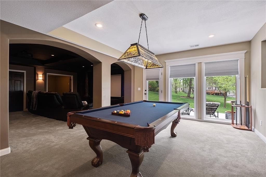 This spacious recreation room features a classic wooden pool table with blue felt, positioned centrally on plush beige carpeting. Its rich, dark wood legs and fringed pockets add a traditional touch. Above hangs a stylish, stained-glass pendant light, casting warm tones that enhance the inviting atmosphere. The room opens via a wide archway to a dimly lit seating area, suggesting a media or lounge zone. Large windows and a glass door offer abundant natural light and views of a lush green backyard, blending indoor leisure with outdoor tranquility. Neutral walls and white trim complete the refined yet cozy aesthetic.