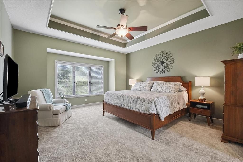 This spacious master bedroom features calming sage green walls paired with soft beige carpeting for a cozy yet elegant ambiance. The room is centered around a sturdy wooden bed frame with a floral-patterned comforter and matching pillows, flanked by mid-century modern nightstands with white ceramic lamps. A large window with blinds fills the space with natural light, positioned above a cushioned cream armchair draped with a light blue throw for added comfort. Architectural interest is enhanced by a tray ceiling with white trim and a ceiling fan with light, complementing the room’s serene, classic aesthetic.