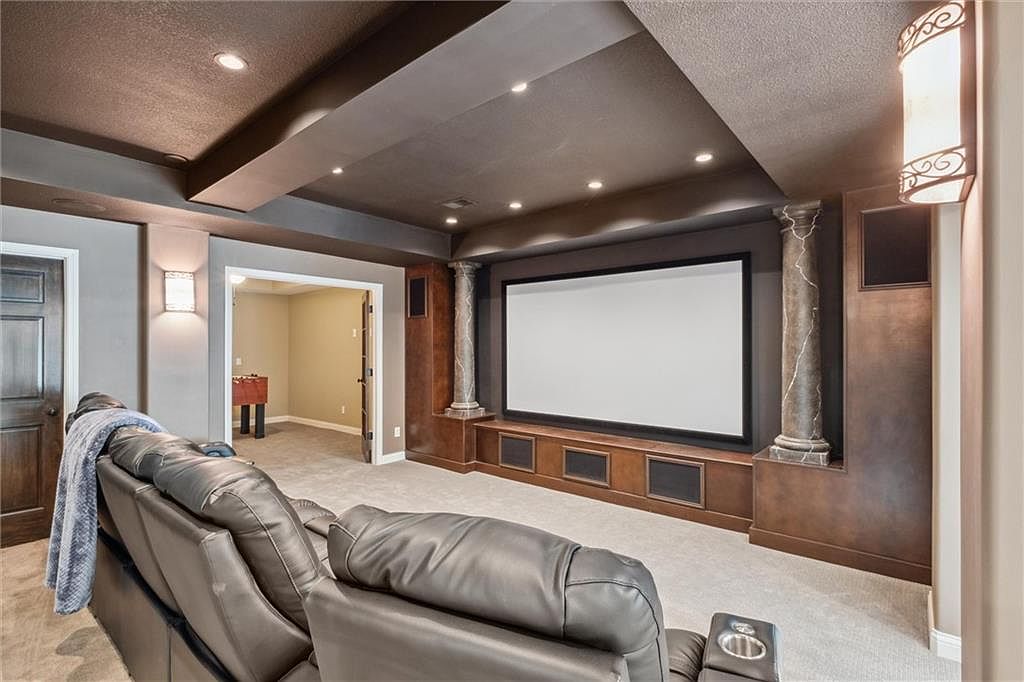 This dedicated home theater space blends comfort with sophistication, featuring a large wall-mounted projector screen framed by sleek wooden cabinetry accented with marble-like columns. The room’s muted gray walls and ceiling create a cozy, darkened environment perfect for movie viewing, enhanced by strategically placed recessed lighting and elegant wall sconces that provide subtle illumination without glare. Plush, dark leather recliners with built-in cup holders form a welcoming seating area, prioritizing relaxation and convenience. Neutral beige carpeting softens the space while linking to an adjacent room visible through a large doorway, inviting flow and connectivity within the home.