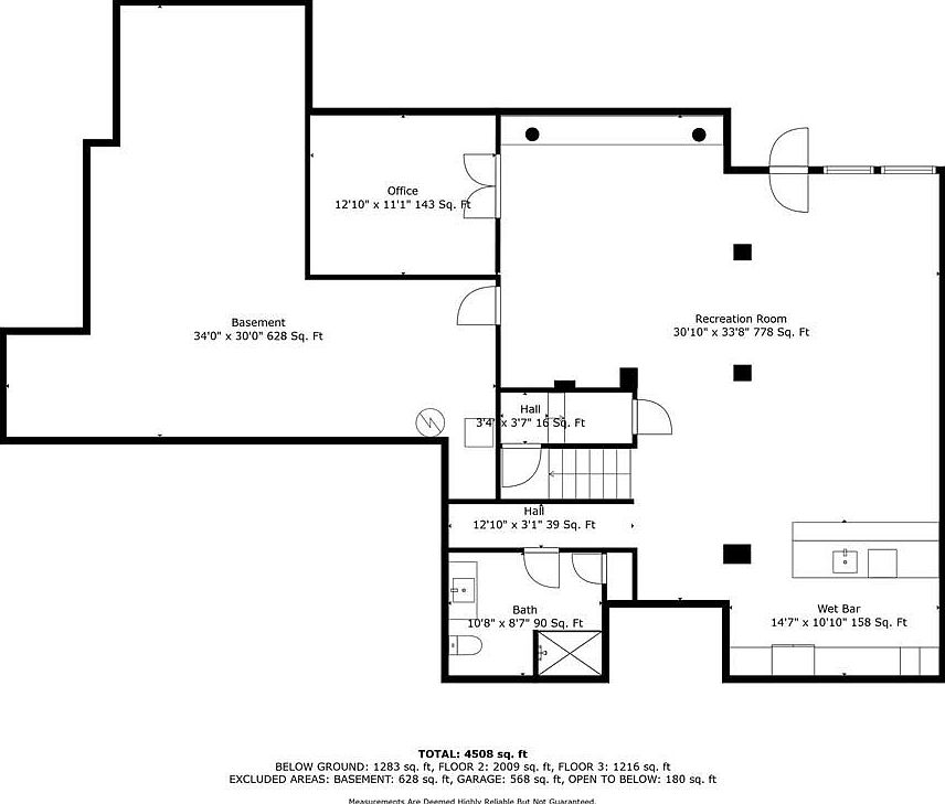 This basement layout includes a spacious recreation room measuring approximately 30’10” by 33’8″, ideal for entertaining or relaxation. Adjacent to it is a well-sized wet bar area (about 14’7″ by 10’10”) offering ample counter space and cabinetry for refreshments. Near the center, there is a straightforward hallway connecting the stairs to various rooms, including a 12’10” by 11’1″ office, perfect for a home workspace. The plan also features a functional bath of 10’8″ by 8’7″, located conveniently next to the stairwell. Overall, the basement boasts practical zoning with clear divisions for work, leisure, and utilities.