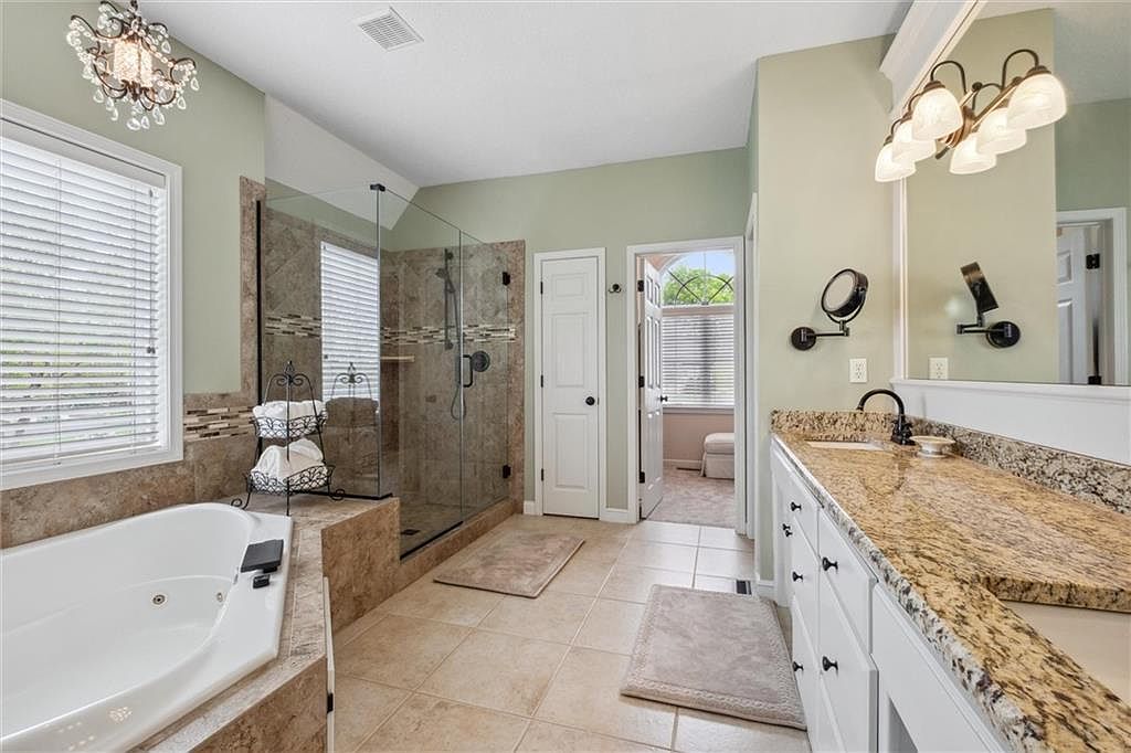 This spacious master bathroom combines elegance and functionality with a soothing green wall color that complements the warm beige tile flooring and natural stone accents. The corner jacuzzi tub is framed with matching stone, offering a cozy spot for relaxation beneath a window with white blinds. Adjacent to the tub, a glass-enclosed walk-in shower features a decorative tile border and dark hardware, enhancing the sophisticated look. Opposite, a long granite countertop stretches across a white vanity with black knobs, illuminated by a traditional three-light fixture. Thoughtful touches like plush floor mats and built-in makeup mirrors add convenience and charm.