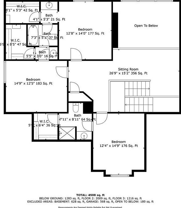 This second floor plan features a thoughtful arrangement of three bedrooms, each with generous dimensions ranging from approximately 176 to 183 square feet. Each bedroom is complemented by a walk-in closet (W.I.C.) for ample storage, enhancing the living space functionality. The floor boasts three bathrooms of varying sizes, including one sizeable bath adjacent to the largest bedroom, promoting convenience. At the heart of the floor, a spacious sitting room measuring 26’9″ by 15’2″ serves as a communal area, with an open-to-below design adding volume and light from the lower level. Stair access is centrally located, balancing private and shared spaces perfectly.