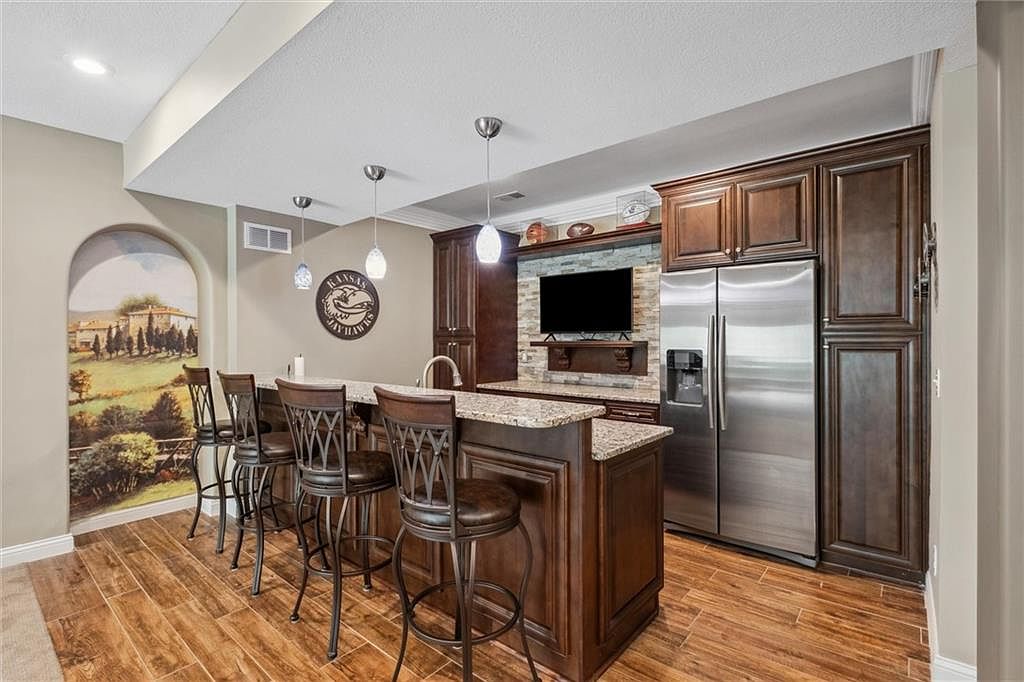 This cozy home bar area features a warm, inviting layout with a rich wood theme. A granite countertop island with a built-in sink is complemented by four high-back metal stools with leather cushions. The cabinetry is crafted from dark wood with elegant detailing, surrounding a stainless steel refrigerator and a small mounted TV above a stone-tiled backsplash. The flooring resembles natural wood planks, adding texture and a rustic touch to the space. Neutral beige walls set a mellow backdrop, while a decorative Kansas Jayhawks wall emblem and an artistic mural in an arched niche enhance the room’s character and charm.