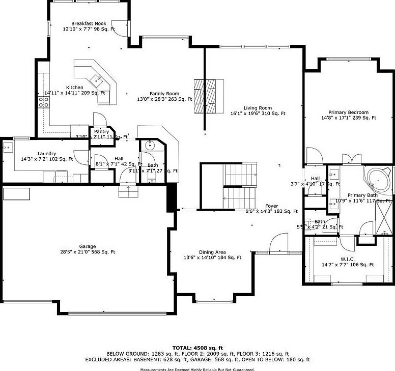 This thoughtfully designed floor plan encompasses a spacious and functional layout spread over 4,508 square feet. A wide foyer opens into a large living room measuring 16’1″ by 19’6″, creating a central gathering space adjacent to the family room, kitchen, and breakfast nook. The kitchen features a large island and nearby pantry, seamlessly integrated with a cozy breakfast nook. The dining area sits near the home’s entrance, providing a formal dining option. The expansive primary bedroom boasts an en-suite bath, walk-in closet, and privacy. Practical spaces include a laundry room, two additional baths, and a sizeable 568 sq. ft. garage, making this layout both elegant and efficient.