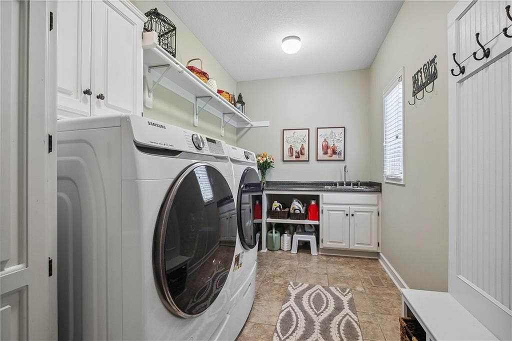 This laundry room features a functional and organized layout with a front-loading Samsung washer and dryer set positioned along one wall. Above the appliances, a long white shelf holds decorative baskets and other items, contributing both storage and visual interest. The walls are painted a soft, calming light green that complements the neutral tiled floor. Opposite the machines, a white cabinet and countertop provide a workspace, with open shelving below storing cleaning supplies. Two botanical prints add a touch of charm above the granite-look countertop, while a small window with blinds allows natural light to brighten the space. A patterned rug and wall-mounted hooks enhance both style and utility, making this laundry room inviting and efficient.