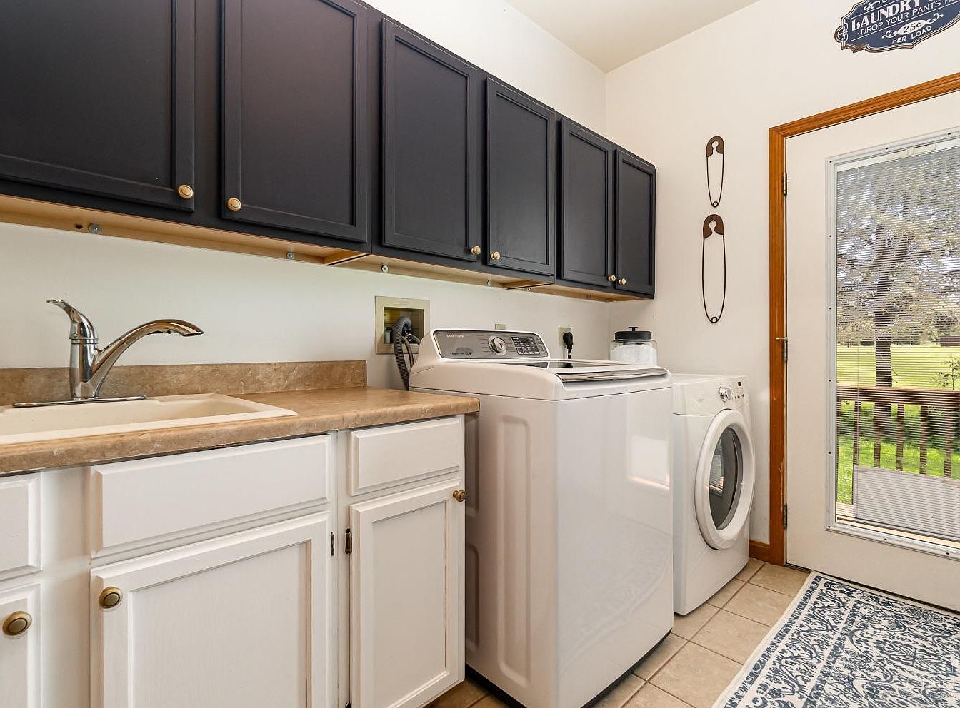 This laundry area features a practical and clean setup with a top-loading washer and front-loading dryer side by side. Above, matte black cabinets with brass knobs provide ample storage, contrasting sharply with the white lower cabinets beneath a neutral-toned countertop. A stainless steel faucet and sink offer functionality for handwashing or pre-treating clothes. Natural light filters through the door with built-in blinds, leading to an outdoor space, enhancing the room’s airy feel. The tiled floor and decorative blue and white rug add subtle warmth and texture, balancing utility with a cozy aesthetic.