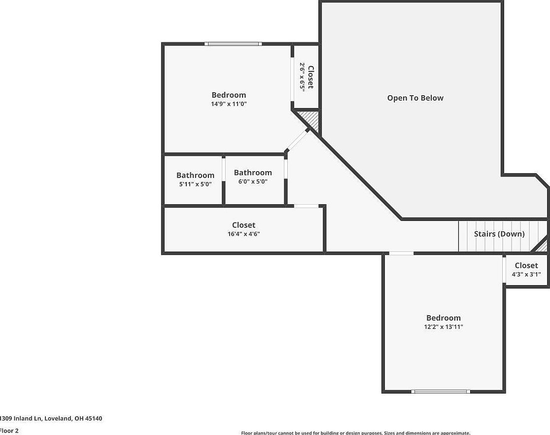 This upper floor plan features two bedrooms with differing dimensions, designed for privacy and comfort. The larger bedroom, measuring about 14’9″ by 11′, includes a small closet while the smaller bedroom, approximately 12’2″ by 13’11”, offers an adjacent closet space. Two compact bathrooms, one 5’11” by 5′ and the other 6′ by 5′, serve the bedrooms. A significant open space labeled “Open To Below” provides an airy architectural element overlooking the lower floor, adding depth and openness to the home’s design. Stairs connect the levels, and ample closet storage is integrated thoughtfully.