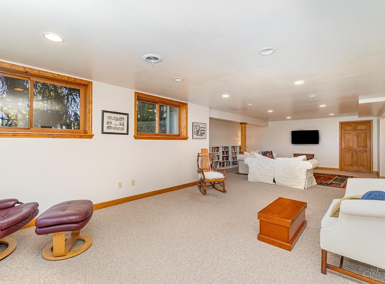 This spacious basement family room features a neutral color scheme with soft beige carpeting and off-white walls, highlighted by natural wood trim around the two modest-sized windows and baseboards, adding warmth. Recessed ceiling lights create an even, inviting illumination throughout the space. Furnishings include comfortable white slipcovered sofas arranged around a wall-mounted flat screen TV, and a cozy reading area with a wooden rocking chair and built-in bookshelves. The room is further accented by a rich wooden chest serving as a coffee table, along with a cream armchair and a burgundy leather recliner with matching footrest, blending comfort and traditional charm.