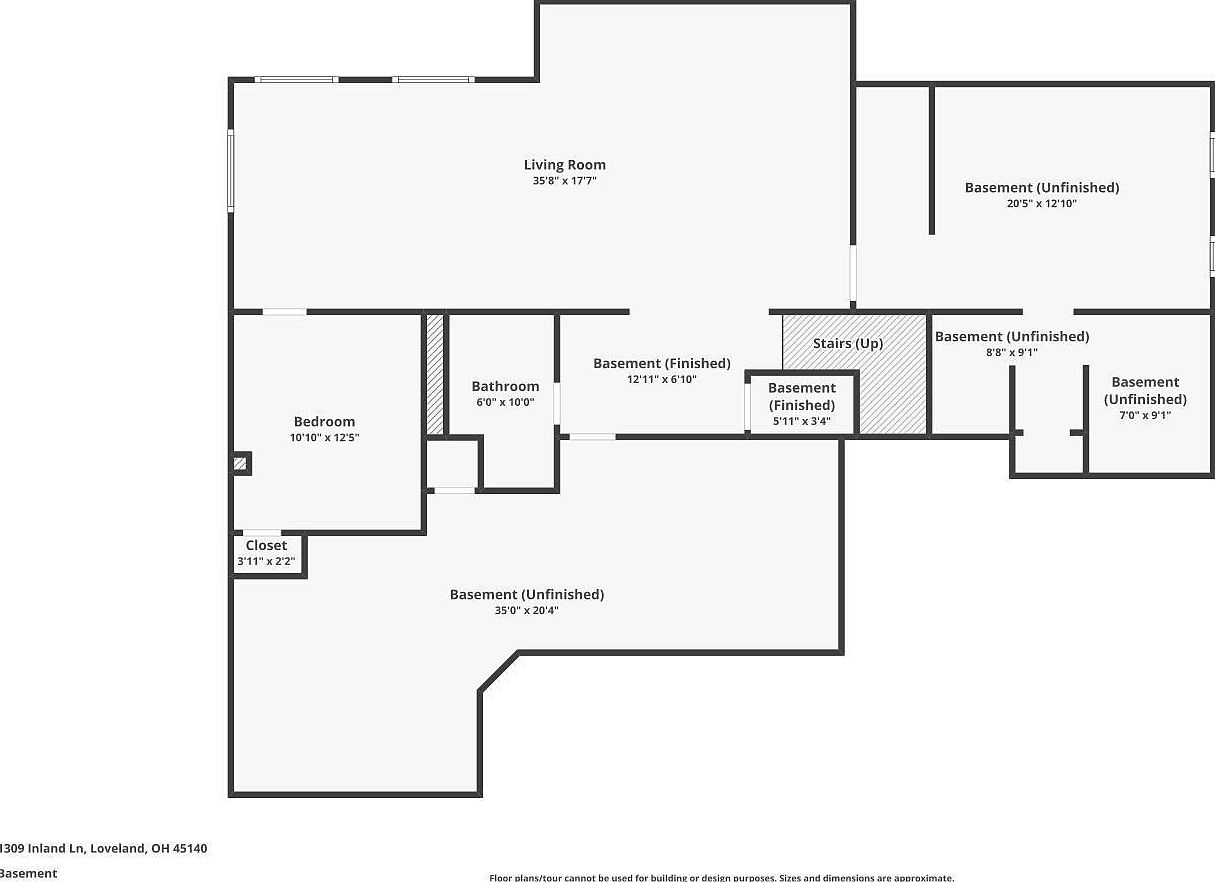 This basement layout features a combination of finished and unfinished spaces, creating versatile areas for various uses. The largest portion is an expansive unfinished basement measuring 35’0″ x 20’4″, ideal for storage or future development. There are multiple finished basement sections, including a narrow 12’11” by 6’10” area and a smaller 5’11” by 3’4″ space, offering potential cozy living or recreational rooms. A bedroom and bathroom are located on one side, adding comfort and functionality. The design incorporates practical flow from the stairs leading up and various access points to different basement zones.