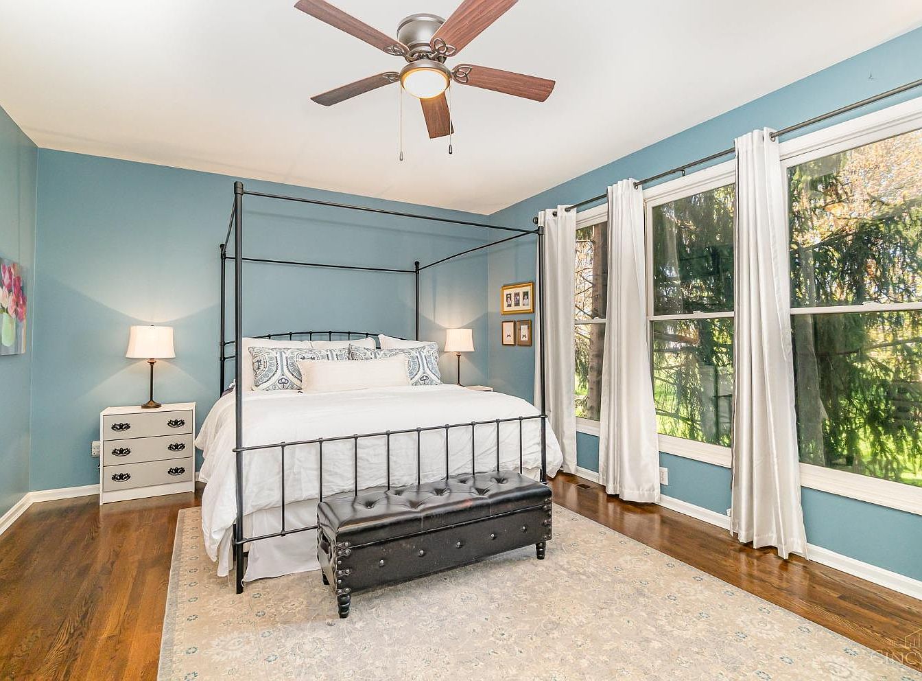 This serene master bedroom features soft blue walls contrasted with white trim, creating a calming ambiance. A black metal canopy bed serves as the centerpiece, dressed in crisp white linens accented with subtle patterned pillows. On either side, white nightstands with matching lamps provide balanced symmetry and warm lighting. The room’s floor is rich hardwood, partially covered by a large, cream-colored rug with muted, intricate patterns adding softness underfoot. Large windows along one wall invite natural light while framed with simple white curtains. A tufted black storage bench at the foot of the bed adds functionality and style, complementing the bed frame’s dark finish. A ceiling fan with wooden blades completes this inviting, comfortable sleeping space.