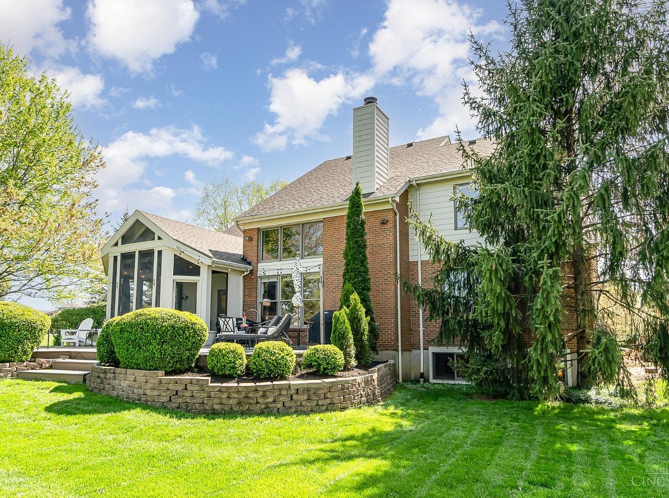 This garden space showcases a well-maintained lawn bordered by neatly trimmed shrubs and small conifer trees, creating a lush and inviting outdoor area. The home’s exterior combines red brick with light gray siding for a subtle yet classic contrast. A raised stone planter adds texture and structure to the space. The patio features comfortable outdoor furniture arranged around a parasol, perfect for relaxation or social gatherings. A screened porch extends from the main house, offering a sheltered retreat to enjoy nature with protection from insects. Large windows and a central chimney add architectural charm, while mature trees provide natural privacy and shade.