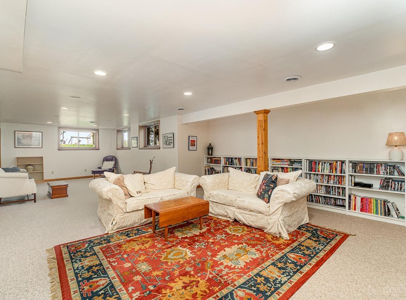 This spacious basement living area features a neutral color palette with beige carpeting and off-white walls, creating a bright and welcoming atmosphere. The focal point is a pair of comfortable, cream-colored sofas adorned with mix-and-match cushions, arranged around a warm wooden coffee table atop a vibrant, patterned area rug in shades of red, blue, and gold. Built-in bookshelves line one wall, filled with books and media, enhancing the room’s cozy, inviting feel. Natural light filters in through three small windows, balanced by recessed ceiling lights for ample illumination. A polished wooden column adds architectural interest and warmth to the open layout.