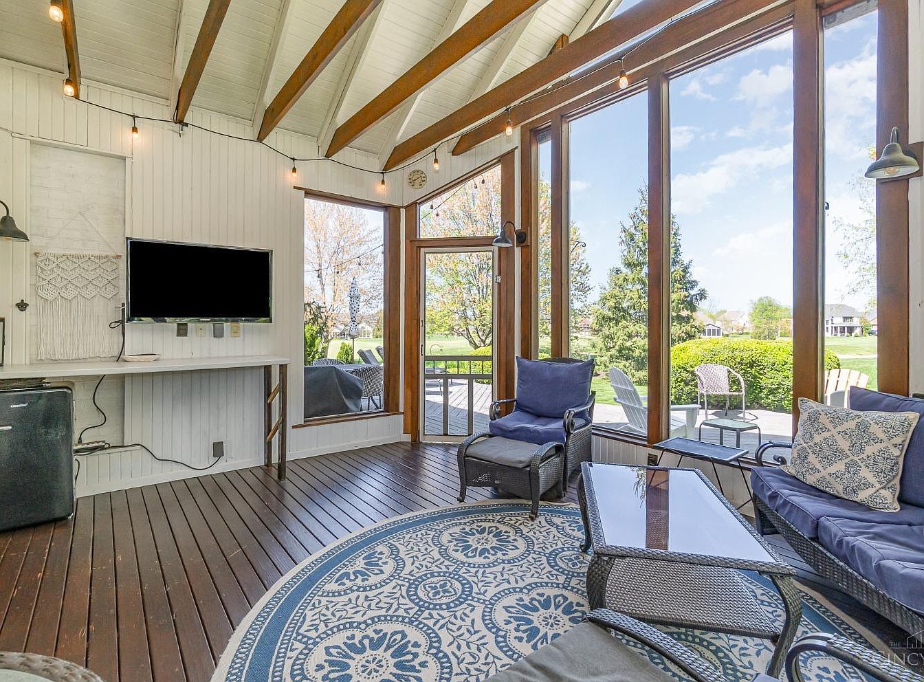 This inviting screened porch blends indoor comfort with outdoor beauty. The dark wood plank flooring contrasts warmly with white shiplap walls and a vaulted ceiling, accented by exposed wood beams. Large floor-to-ceiling windows and a screened door provide an expansive view of lush greenery and distant homes, flooding the space with natural light. The seating area includes cushioned wicker furniture in deep navy blue, complemented by patterned throw pillows and a distinctive round rug featuring a blue and white ornate design. Subtle string lights and wall sconces add a cozy ambiance for evening relaxation. A mounted flat-screen TV and compact mini-fridge complete the functional yet serene atmosphere perfect for social gatherings or quiet moments.