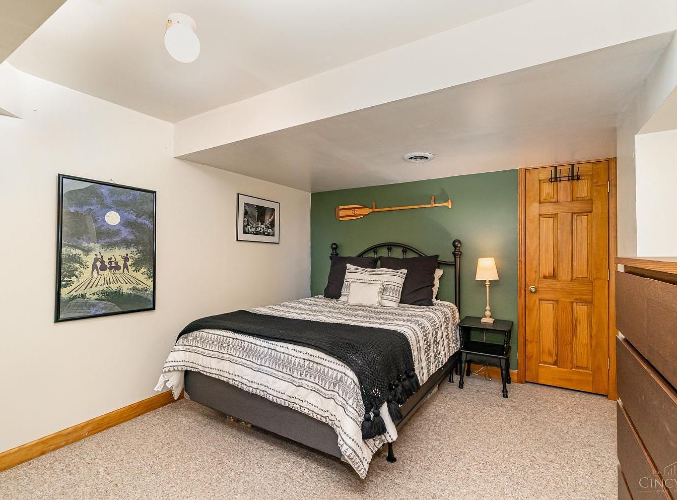 This intimate bedroom features a tucked-in sleeping area framed by a striking deep green accent wall behind the bed, adding warmth and a nature-inspired tone. A wooden paddle mounted above the bed brings a rustic, outdoorsy charm. The bed itself is dressed in black, white, and gray patterned linens, complemented by solid black pillows and a textured black throw. Light tan carpeting softens the space underfoot, while wood trim and matching honey-tone wooden door add natural warmth. Art on the side wall introduces subtle color and personality, with black nightstand and lamp providing functional bedside details.