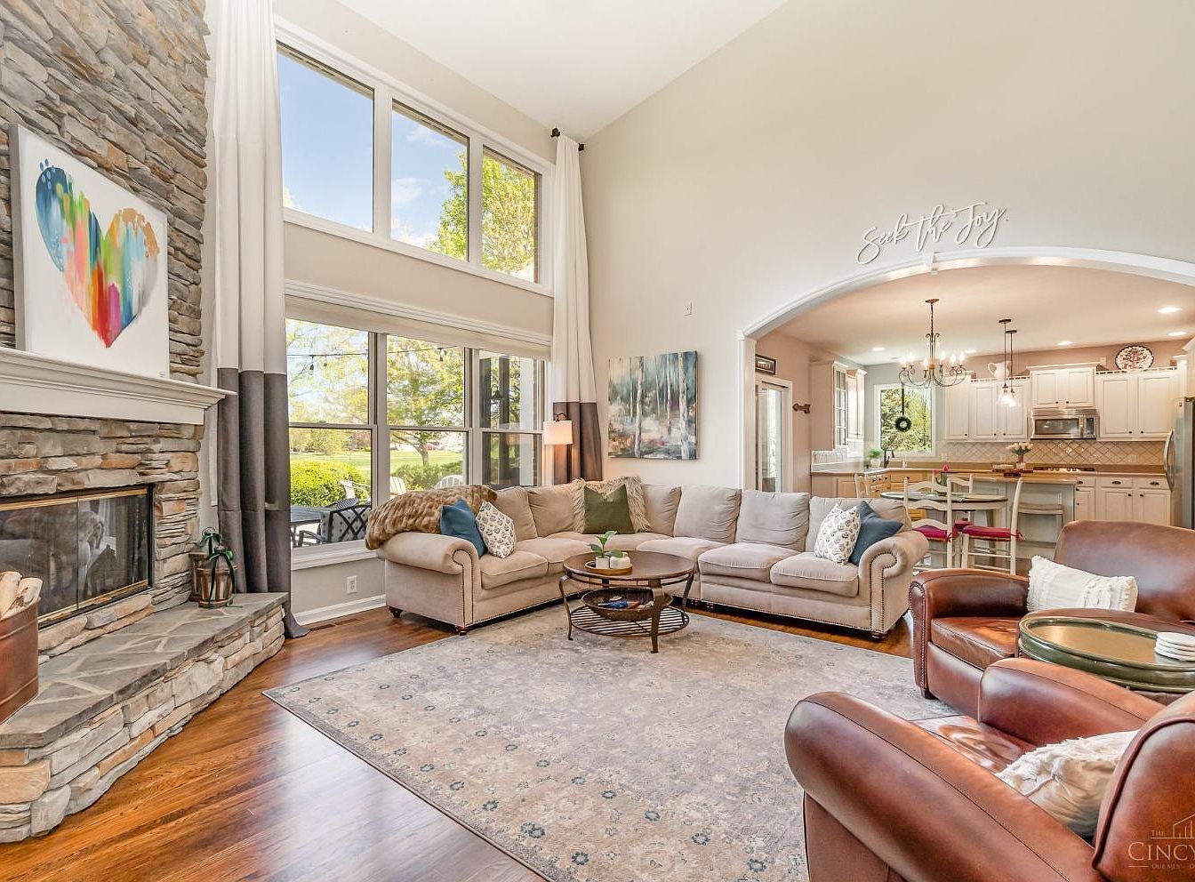 This spacious living room features a high vaulted ceiling and large windows that flood the space with natural light while offering serene outdoor views. The centerpiece is a stone fireplace with a rustic hearth that adds warmth and texture. A plush beige sectional sofa with a mix of decorative pillows faces a pair of rich brown leather armchairs, creating a cozy yet open seating area around a round coffee table. The neutral palette of soft creams, browns, and earthy tones complements the hardwood floors, while the adjacent kitchen, visible through an arched opening, features white cabinetry and a casual dining nook, enhancing the open-concept design. Subtle art pieces and soft drapery contribute to a welcoming, family-friendly atmosphere.