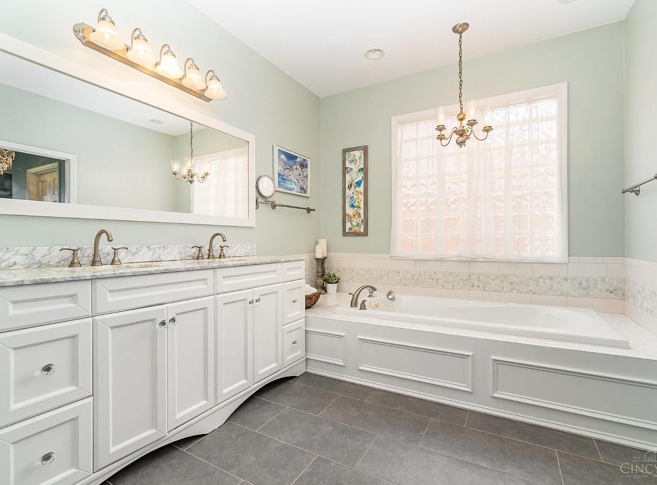 This bathroom features a soothing, pale mint wall color creating a calm atmosphere. The white cabinetry under the double-sink vanity offers ample storage, topped with a sleek marble countertop and dual brushed nickel faucets. Above the vanity, a large frameless mirror reflects light from the elegant five-light fixture. The soaking tub, accented with decorative tile trim and a built-in panel, sits beneath a frosted glass block window draped with sheer curtains, adding privacy and softness. Gray ceramic floor tiles ground the space with a modern touch, while tasteful art pieces and a classic chandelier above the tub enhance the room’s refined aesthetic.