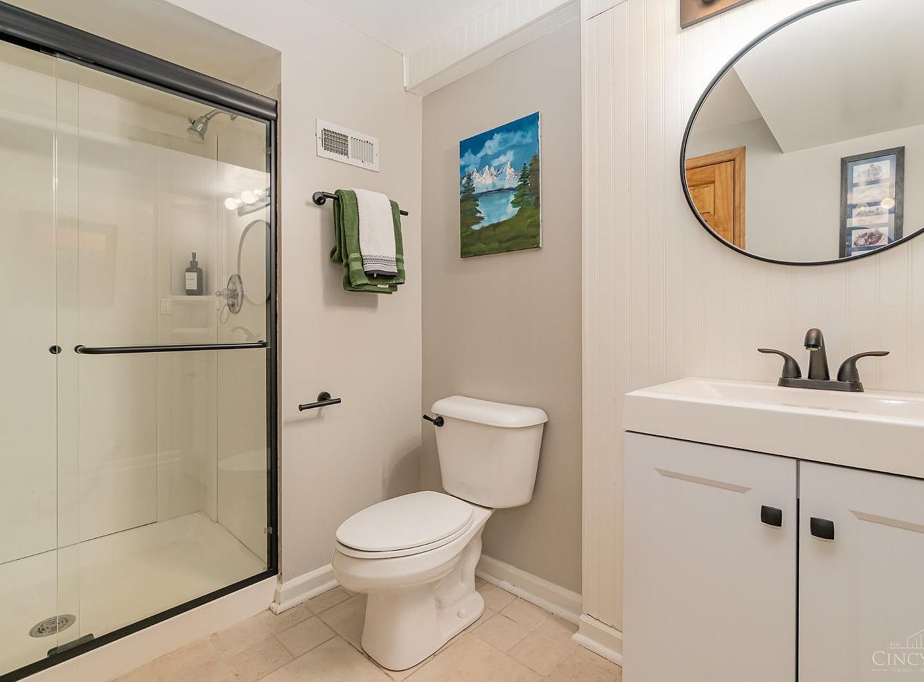 This bathroom offers a clean and functional layout with a neutral palette centered on soft beige walls contrasted by white fixtures. A spacious glass-enclosed shower with black metal framing anchors one side, bringing a modern industrial touch. The white toilet sits neatly beside a towel rack holding green and white towels, adding a subtle pop of color. A simple, white vanity cabinet with black hardware complements the black faucet and a large, oval mirror above, enhancing the sense of space. A serene landscape painting adds a gentle artistic accent, rounding out the calm and practical design.