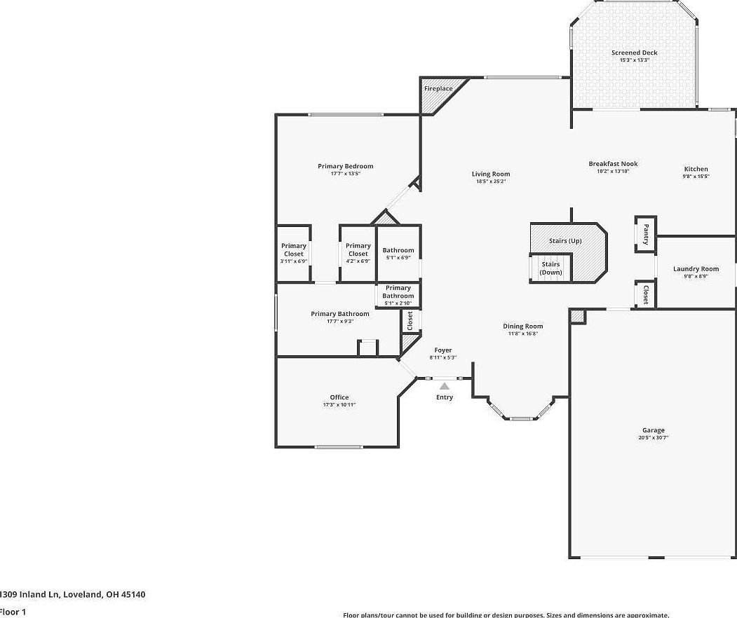 This floor plan offers a clear and efficient layout balancing private and social zones. The spacious primary bedroom occupies one corner, featuring two closets and an attached primary bathroom. Adjacent to it is a dedicated office space, ideal for remote work or study. The central living room, distinguished by a corner fireplace, connects seamlessly to the breakfast nook and kitchen, facilitating easy flow and interaction. A formal dining room near the entry enhances entertaining possibilities. The garage and laundry room are grouped together for practical household management. The screened deck off the breakfast nook extends outdoor living options. Overall, the design focuses on functionality with ample storage and varied room sizes.