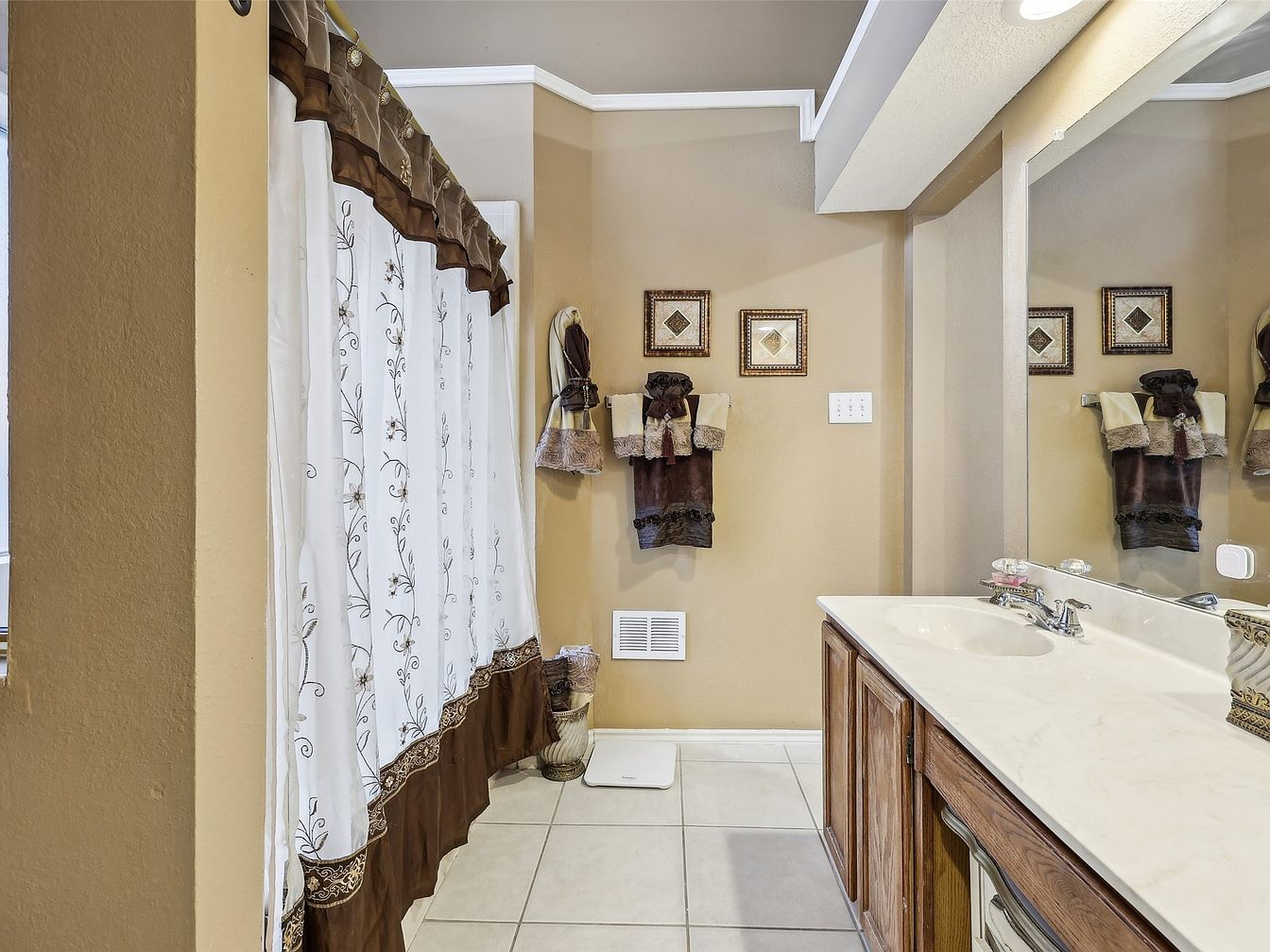 This bathroom features warm beige walls paired with a creamy white tile floor creating a neutral, calming atmosphere. A spacious vanity stretches along one side, topped with a smooth, polished white countertop and wood cabinetry below, providing ample storage and a classic touch. Above the sink, a large mirror extends wide, enhancing the sense of space and light. The shower area is enclosed by a decorative curtain adorned with floral embroidery and trimmed in rich brown, matching the coordinated towels hanging neatly on the wall. The decor subtly combines warmth and elegance with functional design.