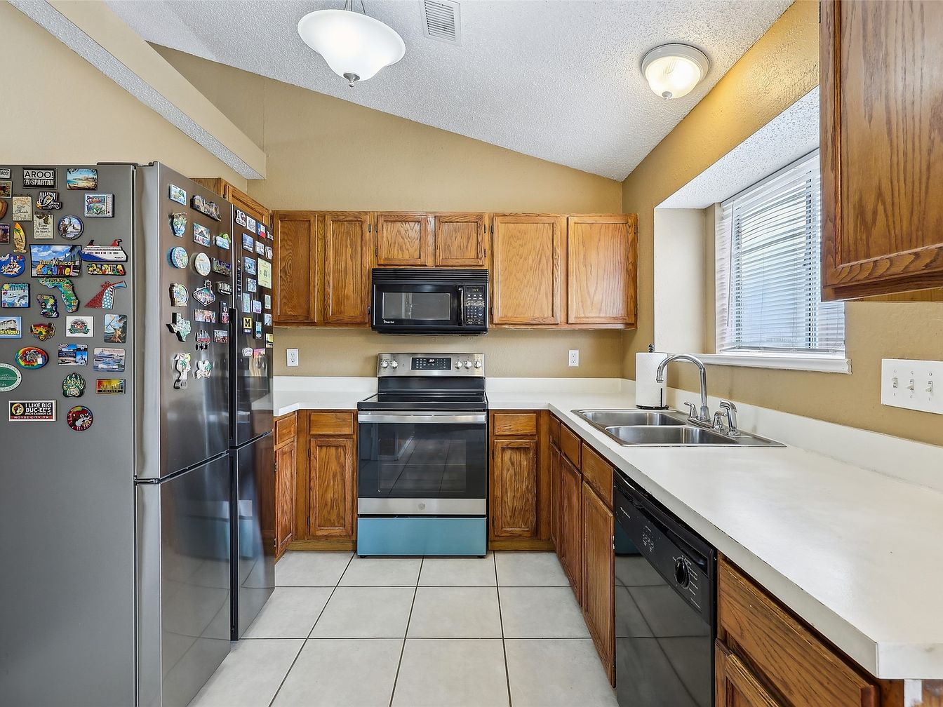 This kitchen features a classic U-shaped layout maximizing counter space and storage. Warm honey-toned wooden cabinets with visible grain add traditional charm, contrasting with the sleek stainless steel appliances, including a refrigerator covered in magnets, an oven, and a microwave. The light beige walls harmonize with the cream countertops and large square ceramic tiles on the floor, enhancing brightness. A double-basin stainless steel sink is positioned beneath a wide window fitted with blinds, providing natural light. Simple light fixtures on the ceiling maintain a practical yet inviting atmosphere for everyday cooking.