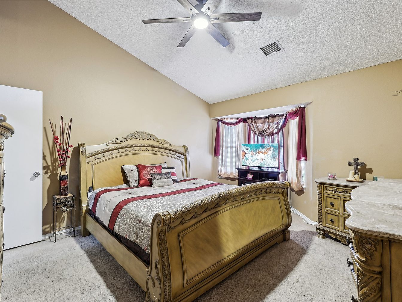 This master bedroom features a warm, inviting color palette with beige walls and soft carpeting underfoot. The centerpiece is an ornately carved wooden bed frame with intricate detailing, complementing the matching dresser and nightstands, all in a light wood finish with a distressed look. Rich burgundy and cream bedding with decorative pillows adds a splash of color. A large window is adorned with sheer beige curtains highlighted by burgundy drapes, allowing natural light to filter gently into the space. A modern ceiling fan with a light fixture provides both illumination and air circulation, enhancing comfort and style.