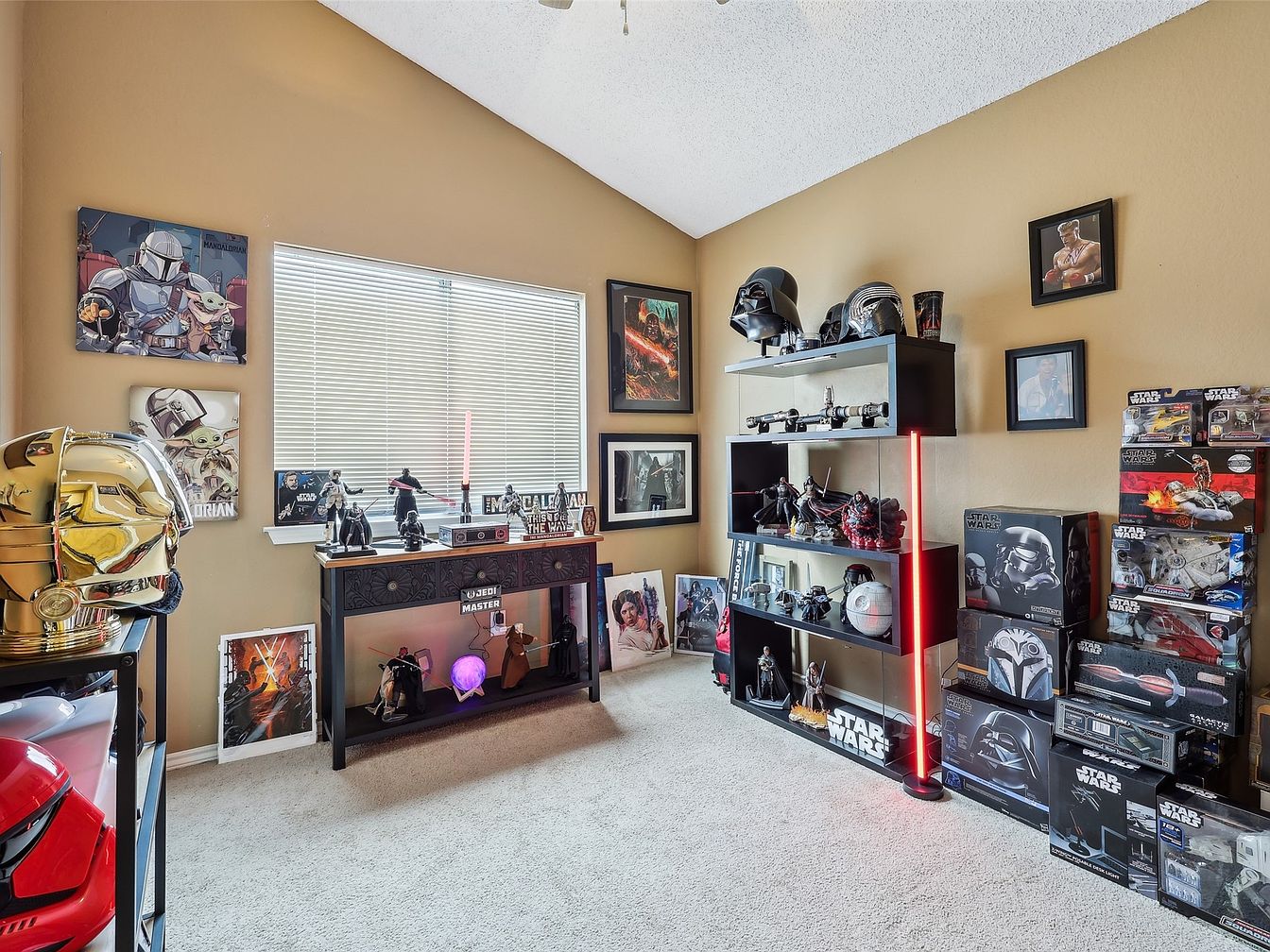 This cozy corner, dedicated to Star Wars fandom, features beige walls and a vaulted ceiling with white popcorn texture, complemented by light beige carpeting. A large window with horizontal blinds allows natural light to brighten the room. Black shelving units and a console table display an extensive collection of Star Wars memorabilia including action figures, helmets, and themed collectibles. Framed artwork adorns the walls, enhancing the thematic focus. A vertical red light saber styled lamp adds an atmospheric glow near the shelving. The arrangement creates a personal sanctuary for collectors and enthusiasts.