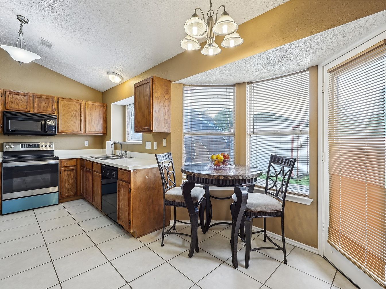 This cozy kitchen area combines practicality with comfort through its layout and design. The cabinetry is crafted from warm, medium-toned wood, complementing the earth-toned walls and beige tile flooring. White countertops frame the sink and cooking area, which features modern black and stainless-steel appliances, including a microwave and oven. A small round marble-top table with two cushioned chairs sits in a bright bay window nook, inviting meals and conversation while enjoying natural light filtered by white blinds. Overhead, two ceiling light fixtures provide ample illumination, enhancing the room’s welcoming atmosphere.