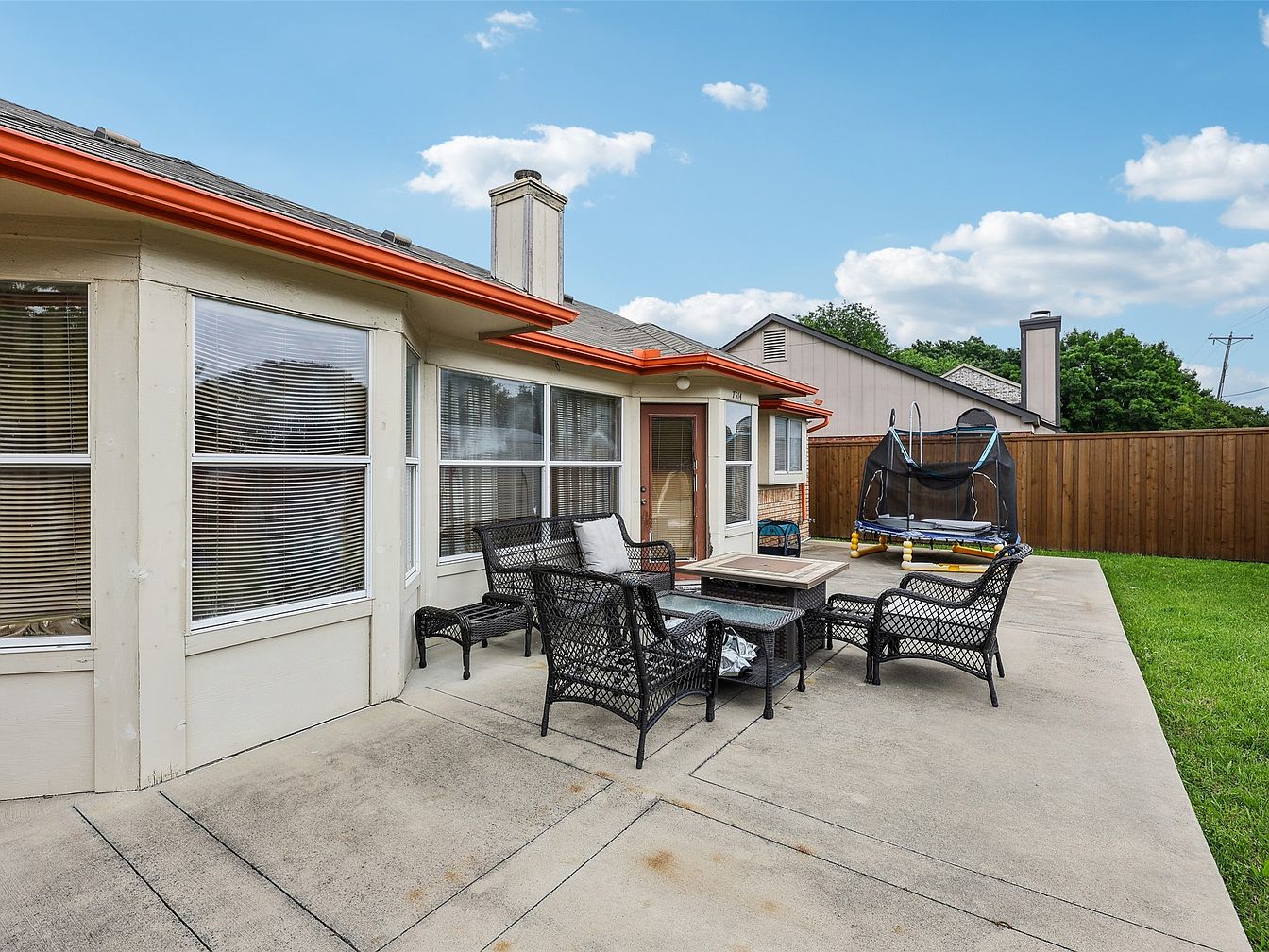 This backyard patio features a cozy seating area comprised of black woven outdoor chairs surrounding a central fire pit table, encouraging relaxed gatherings. The concrete patio extends from the home’s beige exterior walls adorned with large windows and orange-trimmed eaves that add a pop of color. A secure wooden fence encloses the yard, providing privacy. Off to the side, a trampoline hints at family-friendly fun. Green grass borders the concrete, balancing the hardscape with natural elements under a bright blue sky dotted with fluffy white clouds, creating a welcoming and functional outdoor living space.