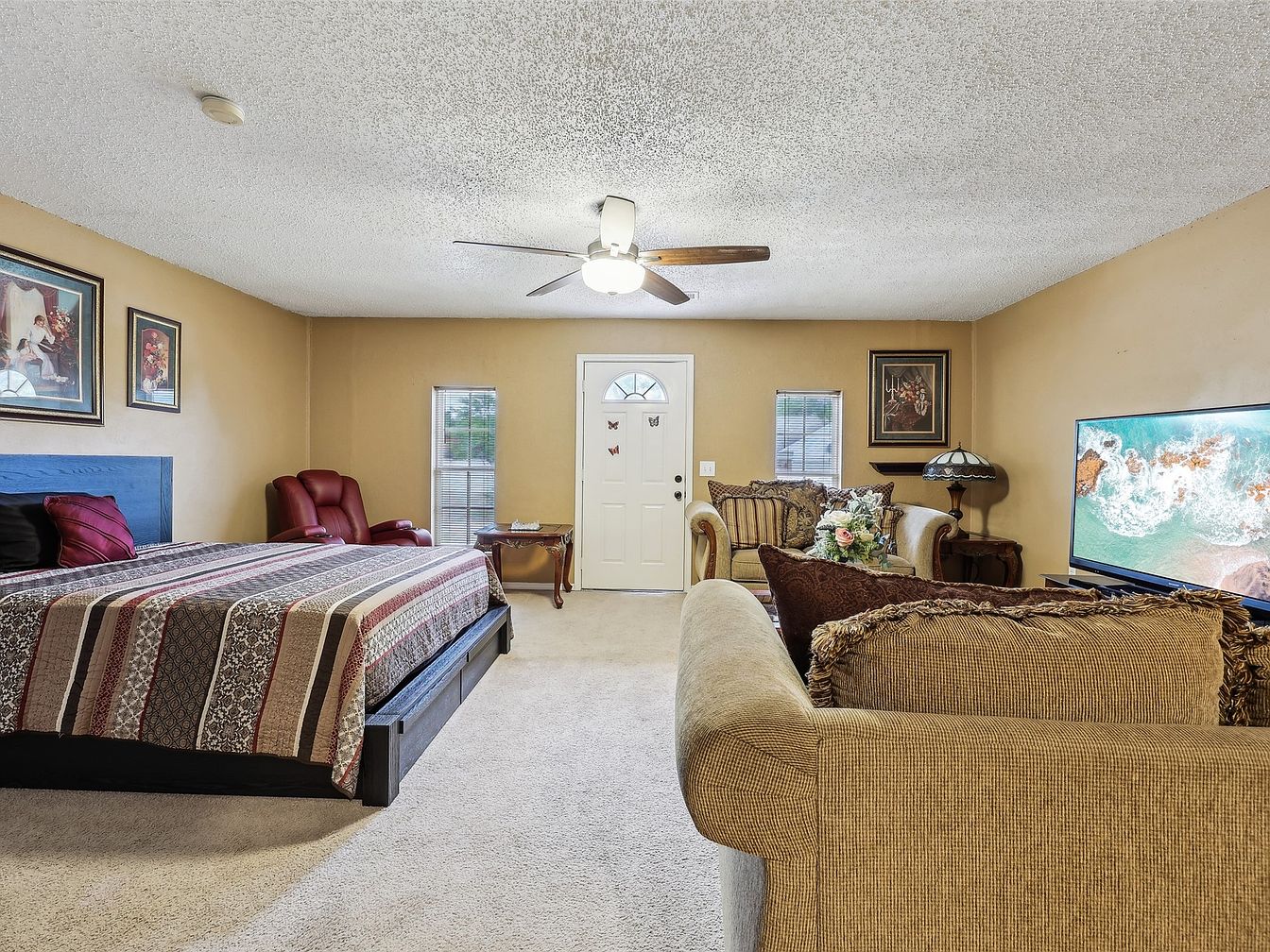 This large, multi-functional bedroom combines sleeping and lounging areas seamlessly. The warm beige walls and cream carpet create a cozy atmosphere, contrasted by a patterned bedspread in earthy tones on a low-profile, dark wood bed frame. A plush, burgundy recliner rests near the window, perfect for quiet reading. The seating area features two cushioned sofas adorned with textured and fringed pillows, facing a flat-screen TV. Framed artwork and a Tiffany-style lamp add vintage charm, while a ceiling fan with wood blades provides practicality. Twin narrow windows flank the white door, bathing the room in natural light.