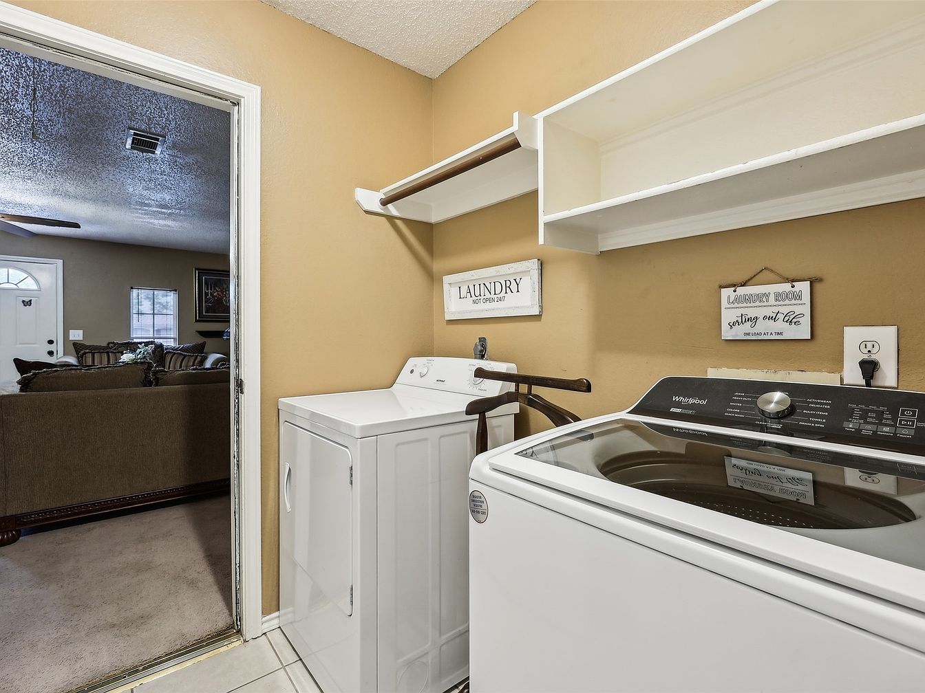 This laundry nook features a compact, efficient layout with a white top-loading Whirlpool washer and a matching dryer side by side against warm beige walls. Above the machines, white open shelves and a hanging rod provide practical storage for laundry essentials and drying clothes. Two humorous, rustic wooden signs add charm, emphasizing the room’s purpose. The tiled floor contrasts softly with the beige walls and matches the adjoining room’s carpet, visible through the open door. Overall, this space combines functionality with a cozy, lived-in feel, connecting seamlessly to the adjacent living area.
