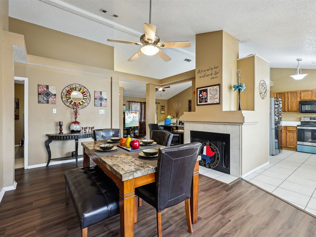 This dining space features a rich earth-toned palette, combining warm beige walls with medium-toned wood flooring that adds depth and coziness. The dining table is topped with a stone-like surface, surrounded by black leather chairs and a matching bench, offering a sleek contrast to the natural wood. A central ceiling fan with light provides both illumination and ventilation, complementing the room’s practical design. A fireplace anchors the area with neutral tile surround and a unique Texas-themed decoration inside. The dining area flows seamlessly into the adjacent kitchen with tile flooring, and subtle architectural columns create partial separation while maintaining openness.