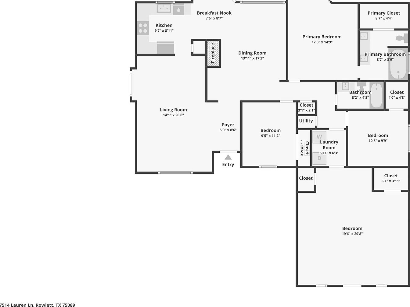 This spacious single-level floor plan features a well-organized layout with distinct living, dining, and private areas. The entrance opens into a foyer that flows into a large living room with a fireplace, connecting effortlessly to the dining room and adjacent kitchen with a breakfast nook. The primary bedroom suite includes a sizeable closet and private bathroom. Three additional bedrooms are located toward the rear with shared bathrooms, and there is a convenient laundry room near the bedrooms. Multiple closets throughout offer ample storage. The design balances communal and private spaces efficiently.