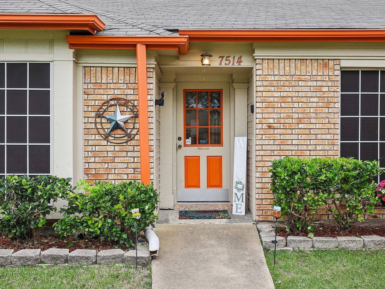 This welcoming front entrance showcases a charming blend of classic and rustic design elements. The orange-trimmed door, which adds a vibrant pop of color, contrasts attractively with the beige brick facade and cream-colored trim. Flanking the entrance are two large windows with white grids, allowing natural light inside. The walkway is bordered by neatly trimmed greenery and low stone edging, contributing a tidy, natural feel to the space. A decorative metal star mounted on the wall and a tall “WELCOME” sign enhance the inviting atmosphere, while the small porch light offers warm illumination for guests.