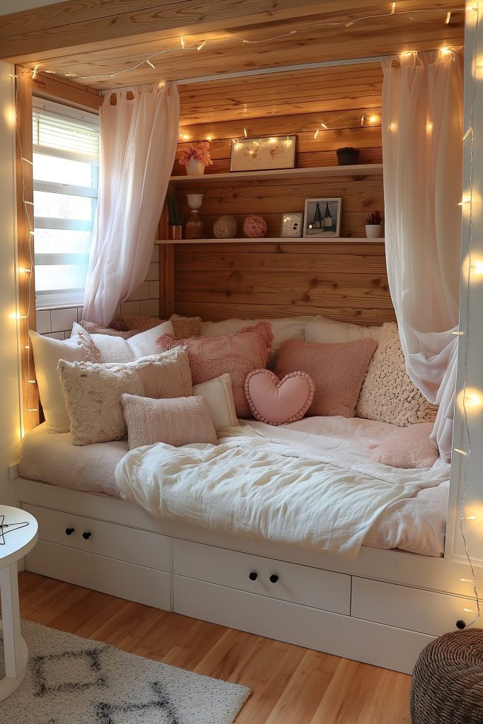 This dreamy bedroom exudes a whimsical ambiance with its twinkling fairy lights. The soft hues of white and pink create a feminine atmosphere, complemented by the plush textures of cotton bedding. Delicate flowers add a touch of sweetness and charm to the overall design.