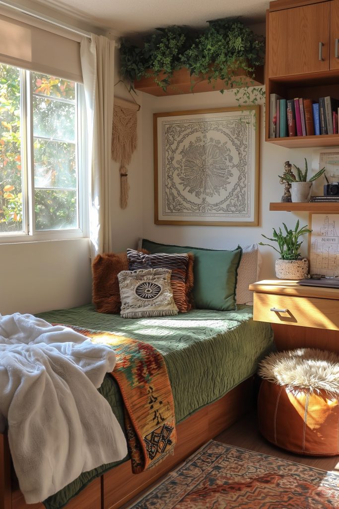 This cozy little bedroom embraces a harmonious blend of calming greens, crisp whites, and earthy browns, exuding a tranquil and natural ambiance. To maximize space, the room incorporates shelving units that double as plant stands, adding a touch of greenery. Vibrantly patterned rugs and pillows add a splash of personality and visual interest to the design.
