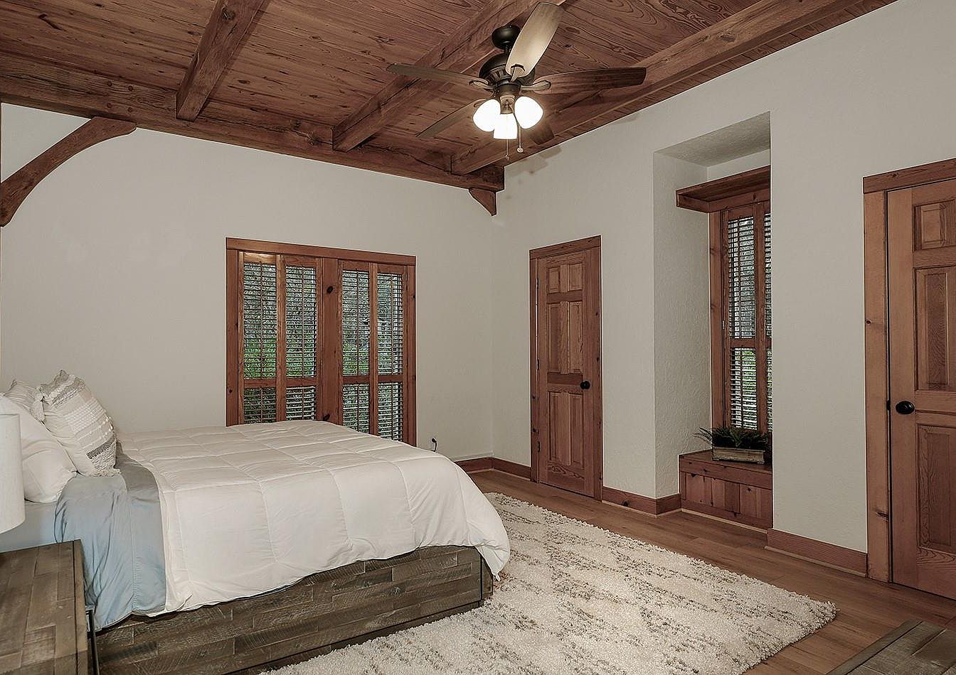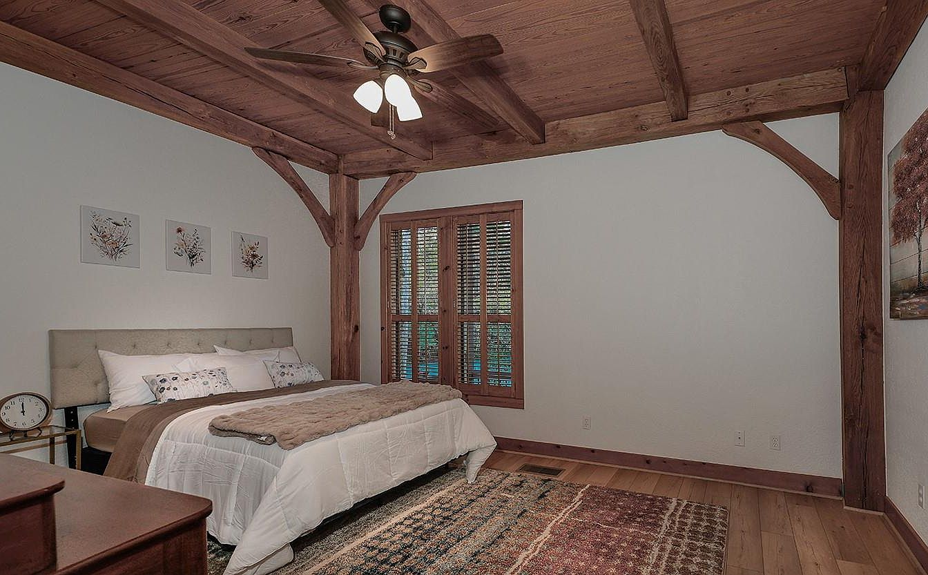 This master bedroom blends rustic charm with modern comfort, featuring exposed wooden beams that frame the ceiling and corners, adding architectural interest. Warm wood tones dominate the ceiling, window frame, and floor, harmonizing with the light neutral walls. A tufted beige headboard complements the mix of crisp white and taupe bedding layered with a cozy, textured throw. The room is anchored by a large, patterned area rug in earth tones, which contributes warmth and depth to the wooden floor. Soft natural light filters through wooden shutters on the window, enhancing the room’s inviting, earthy atmosphere.