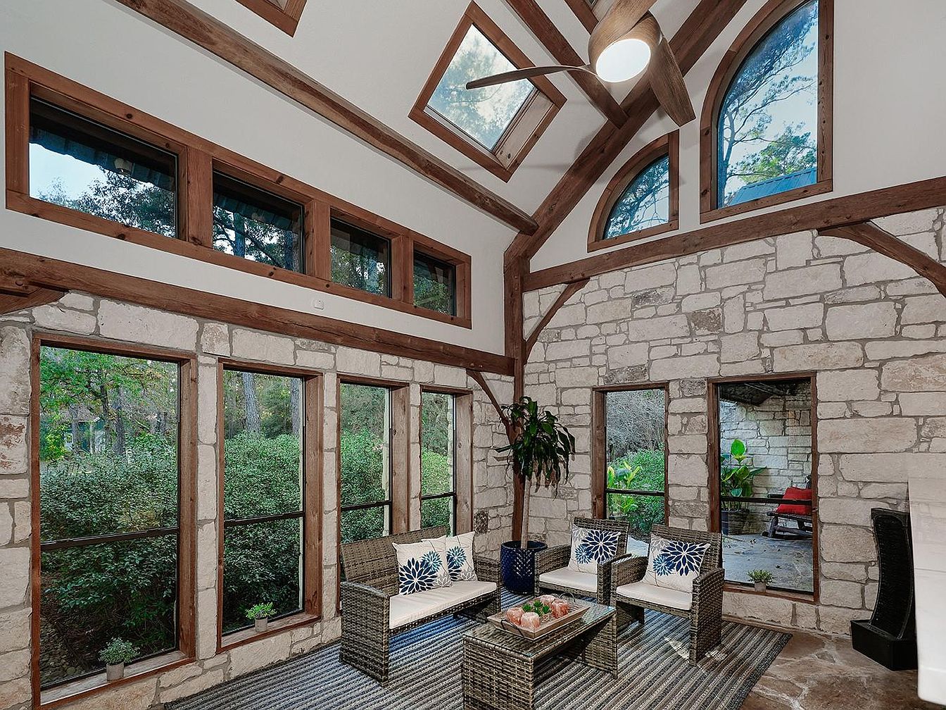 This charming sunroom features high, vaulted ceilings with exposed wooden beams and large skylights, enhancing natural light. Walls are constructed of rustic stone paired with white plaster, lending a cozy yet elegant ambiance. The space includes tall, narrow windows and arched window accents, providing panoramic views of the surrounding greenery. A cozy wicker furniture set with white cushions and blue floral-patterned throw pillows creates an inviting seating area centered around a matching coffee table. A potted plant in a navy blue planter adds a fresh touch, complemented by a striped area rug that grounds the setting in calming, neutral tones.