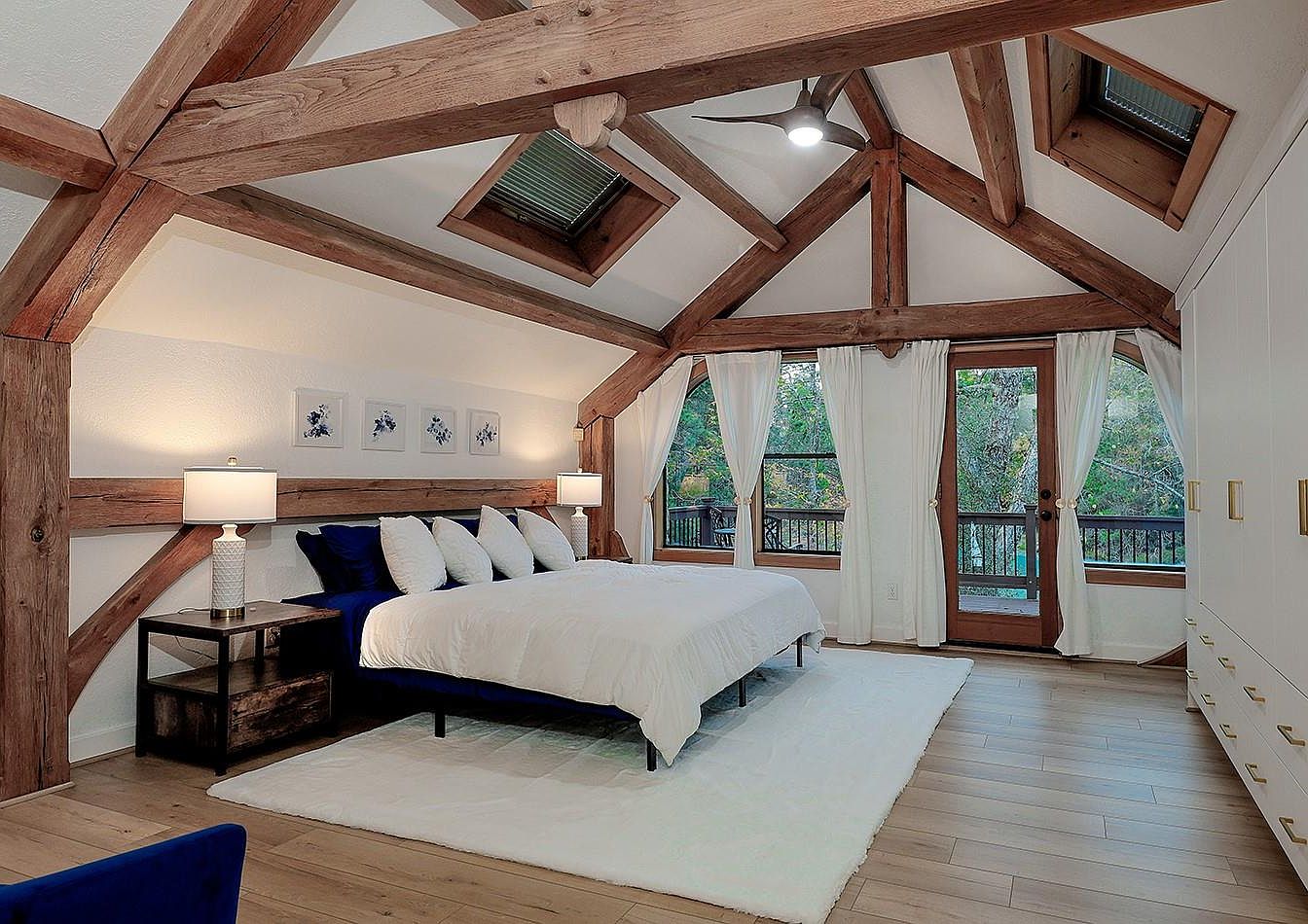 This bedroom features striking exposed wooden beams that highlight the vaulted ceiling, adding rustic charm to the modern aesthetic. Two skylights further brighten the space while a large ceiling fan provides comfort. The color palette is a blend of warm wood tones with crisp white walls and soft, neutral linens accented by deep navy bedding. A plush, white area rug anchors the bed, complementing the sleek wood flooring. Ample natural light floods through large, curtained windows and a glass door leading to an outdoor balcony, blending indoor comfort with nature. Clean-lined built-in cabinetry with brass hardware offers organized storage, completing the serene, airy retreat.