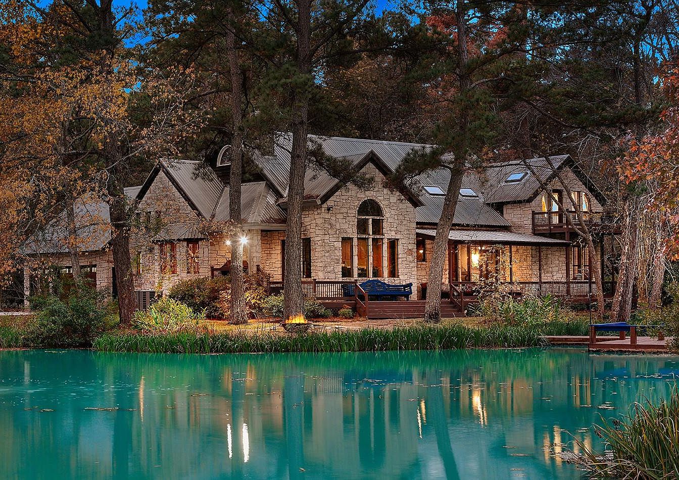 This tranquil backyard space features a spacious wooden dock with natural brown planks and vibrant blue railings, extending over an aqua-tinted pond framed by lush greenery. Surrounding the lake are patches of tall, wild grass, adding a sense of nature’s untamed beauty. The house in the background is a charming stone structure with large windows, a wraparound porch, and a steep metal roof. Mature trees offer shade and privacy, creating a serene outdoor retreat that blends rustic architectural charm with peaceful water views and vibrant natural elements.