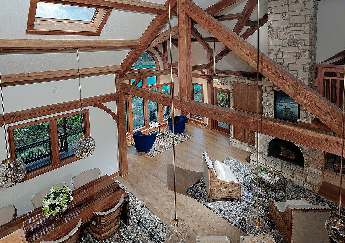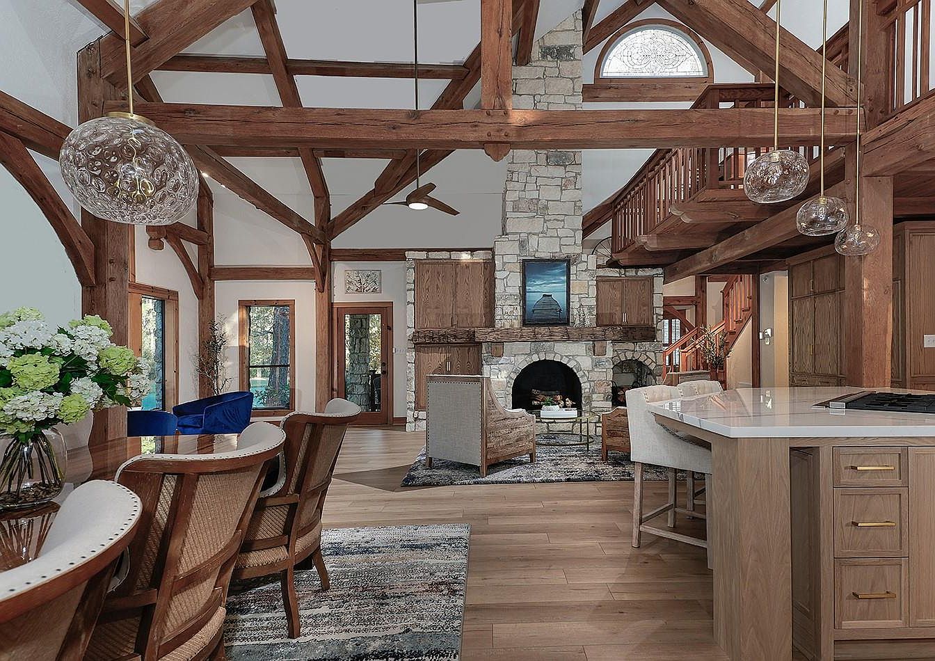 This spacious living and dining area features an open layout characterized by exposed wooden beams and high vaulted ceilings, creating a warm, rustic ambiance. Natural light floods in through large windows and a skylight, highlighting the light wood flooring that complements the robust timber framework. The stone fireplace with its natural texture serves as an impressive focal point. The furnishings blend comfort and style with neutral-toned seating arranged on textured rugs, paired with accent chairs in a bold navy blue near the windows. Modern pendant lighting with glass globes hangs above the dining table, adding elegance while maintaining the cozy, inviting feel of the space.