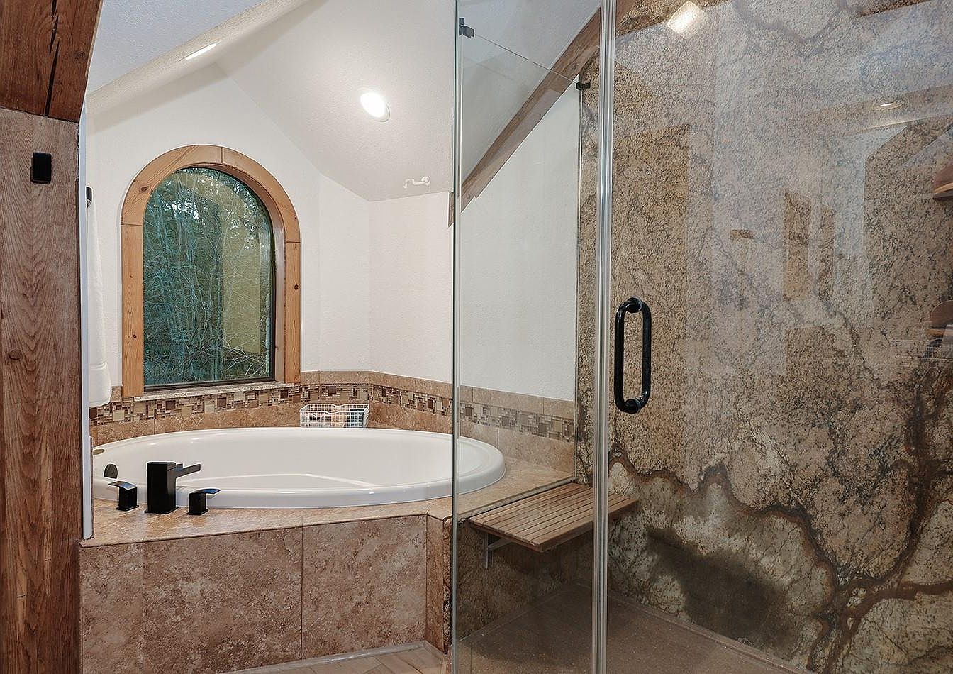 This bathroom area features a large, oval soaking tub set into a surrounding finish of warm, earth-toned stone tiles. The tub deck cascades smoothly into a decorative tile border that wraps the lower walls, blending shades of tan and brown with intricate mosaic accents. Adjacent is a sleek glass-enclosed shower showcasing a dramatic natural stone backdrop with organic veining. The rounded, wood-trimmed window above the tub invites natural light and scenic views. Clean white walls and recessed lighting keep the space bright, while rustic timber beams add architectural warmth and charm to this refined retreat.