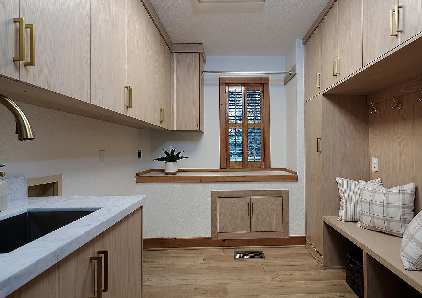 This well-organized laundry and mudroom features a sleek, functional layout with light wood cabinetry dominating both walls, providing abundant storage. The cabinetry has modern brass handles that add a subtle touch of elegance. The countertop is made of smooth white marble, contrasting softly with the lighter wood tones and housing a deep black sink with a brushed brass faucet. On the right is a built-in bench with neutral plaid cushions offering a cozy seating area, complemented by a few hooks above for hanging coats or bags. A small potted plant adds a touch of greenery near a wooden-framed window with shutters, enhancing natural light with a warm, inviting glow. The wood floors match the cabinetry, completing the cohesive, minimalist design of this practical space.