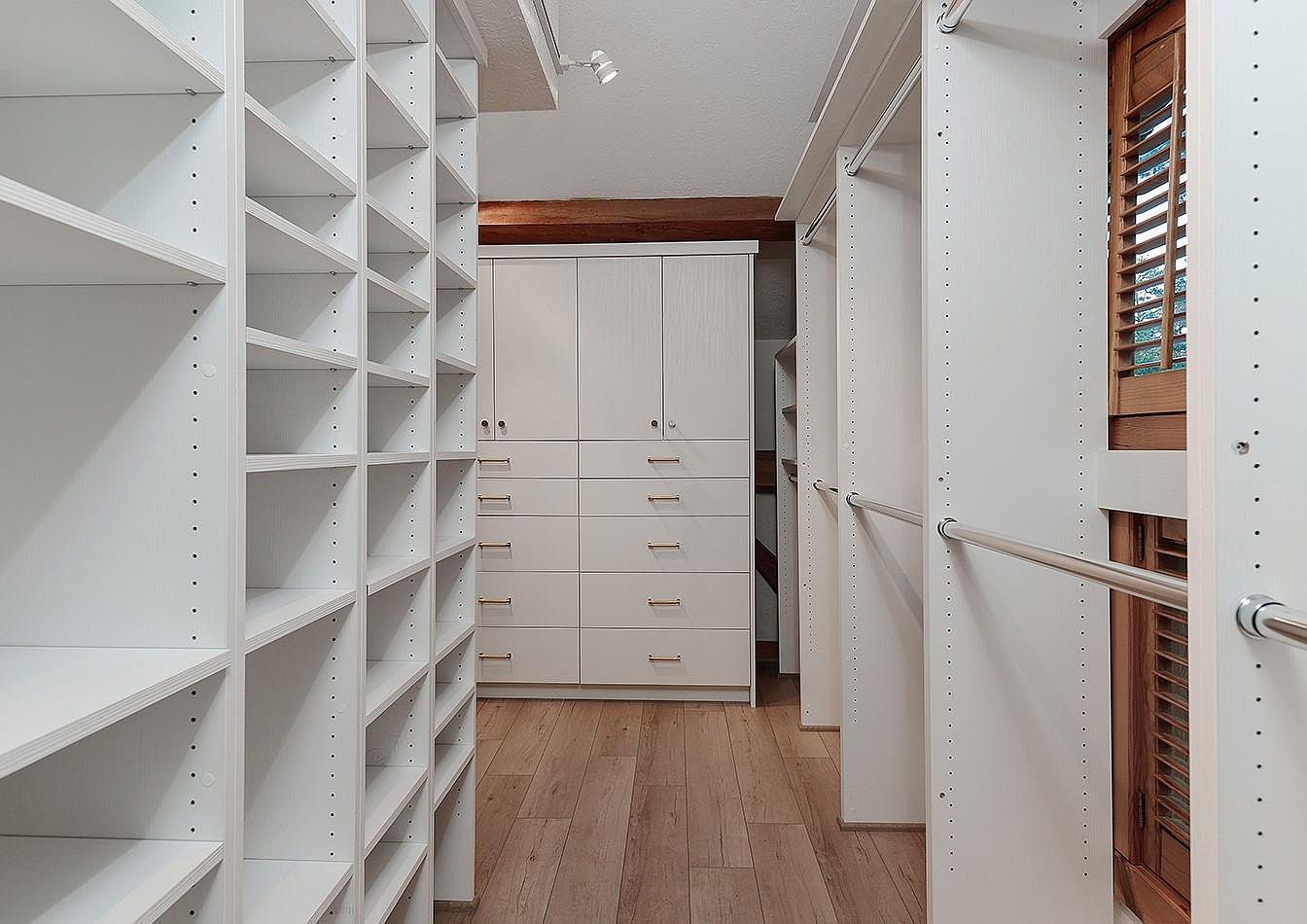 This walk-in closet features a sleek, modern design with extensive white built-in shelving and cabinetry to maximize storage. On the left, multiple cubby-style shelves provide ample space for folded garments or accessories, while the back wall houses a combination of drawers and cabinets for concealed storage. To the right, long hanging rods offer space for hanging clothes, aligned neatly alongside a wooden window with plantation shutters allowing natural light to filter in. The warm wooden floor and ceiling beam introduce a touch of natural texture, balancing the clean, monochromatic cabinetry for a stylish yet functional space.