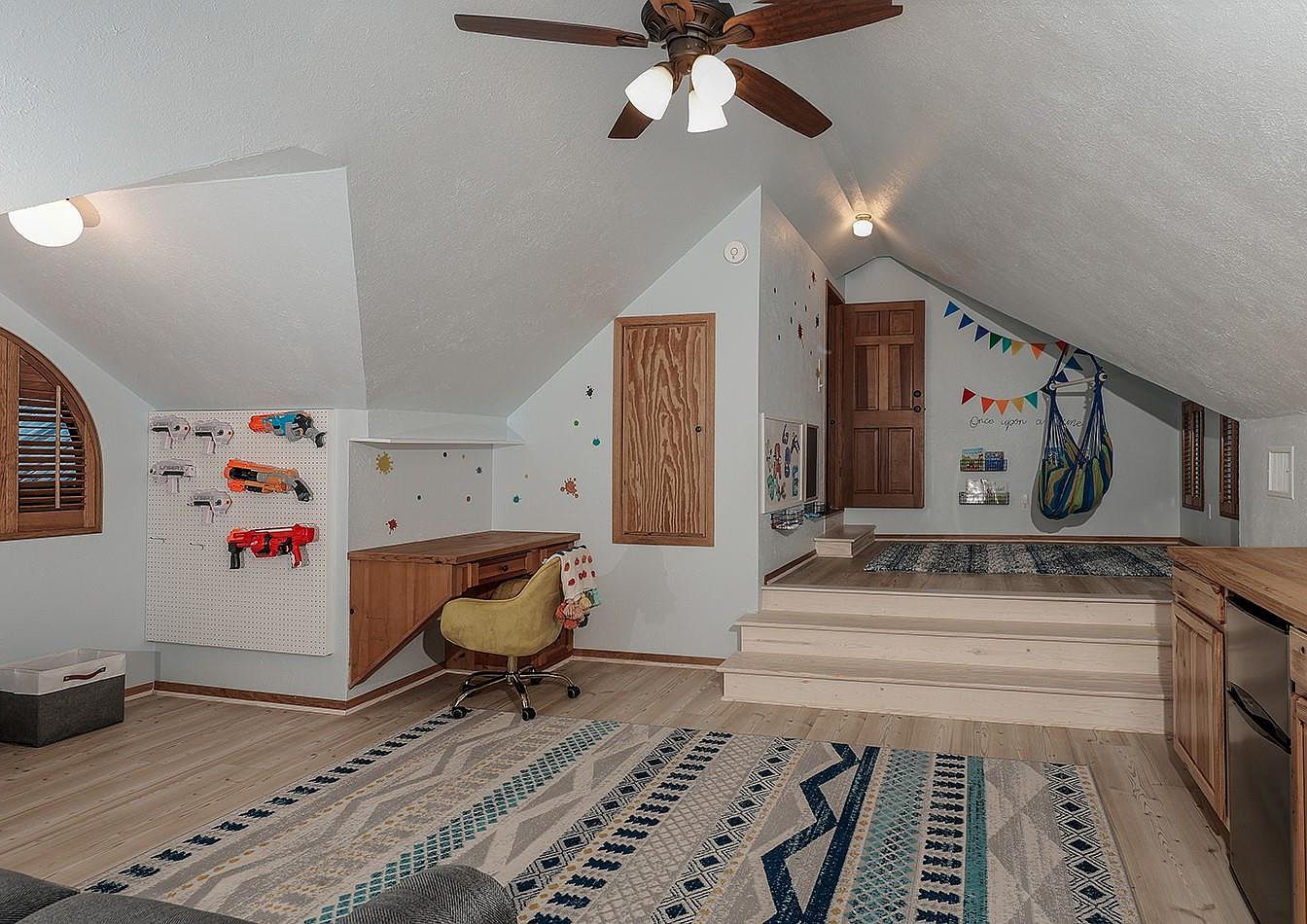This cozy attic space is thoughtfully designed as a multifunctional playroom and workspace. Soft wood flooring complements the neutral, light gray walls, creating a warm and inviting atmosphere. The sloped ceiling adds character and intimacy, while a wooden ceiling fan provides both functionality and rustic charm. A built-in wooden desk with a yellow cushioned swivel chair suits a craft or homework station. The room is playfully decorated with colorful wall decals and a pegboard organizing toy blasters. A raised platform area features a vibrant swing chair hanging beneath tasteful bunting, perfect for relaxation or imaginative play. Natural wood accents on the doors and cabinetry enhance the snug, earthy feel.