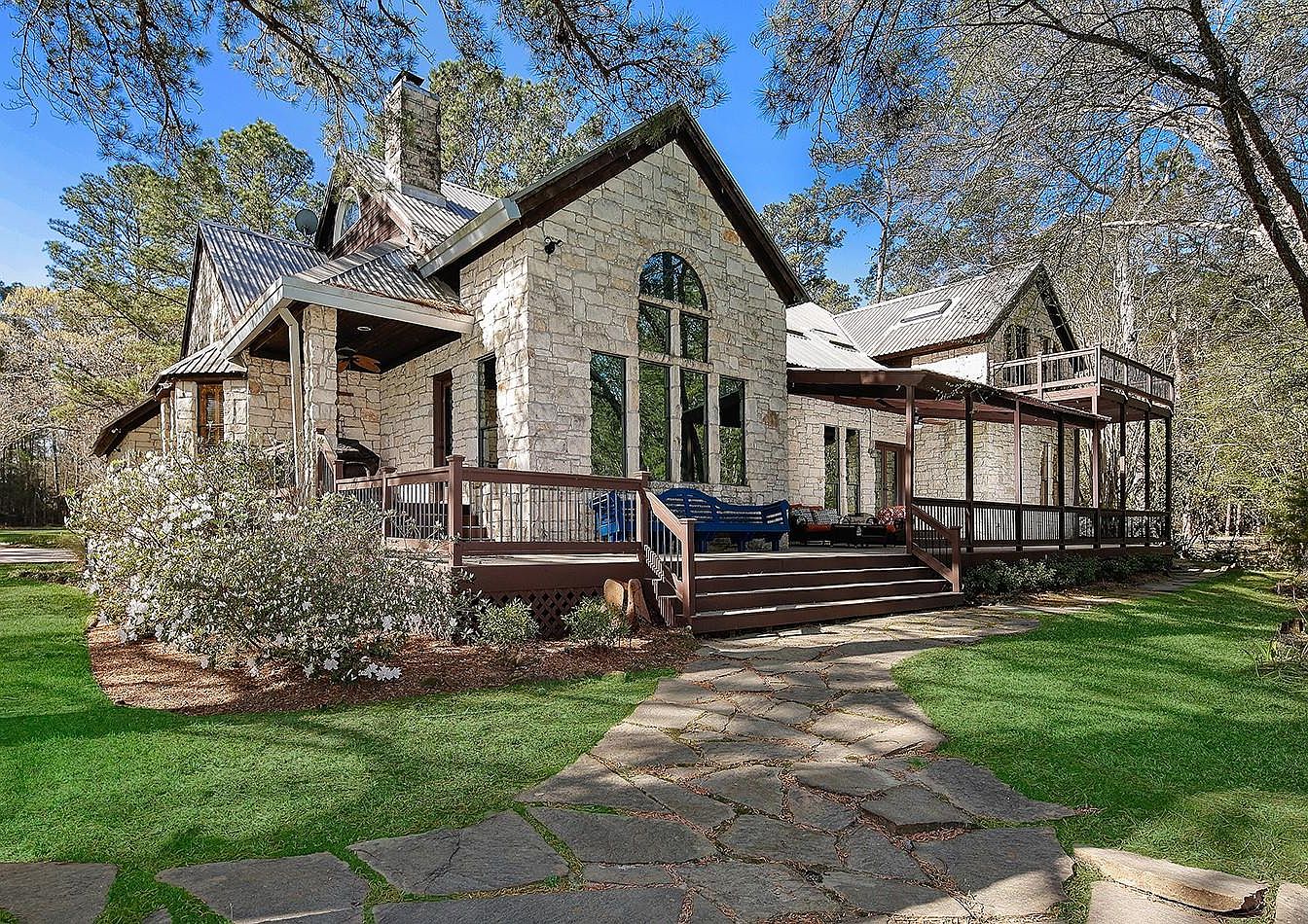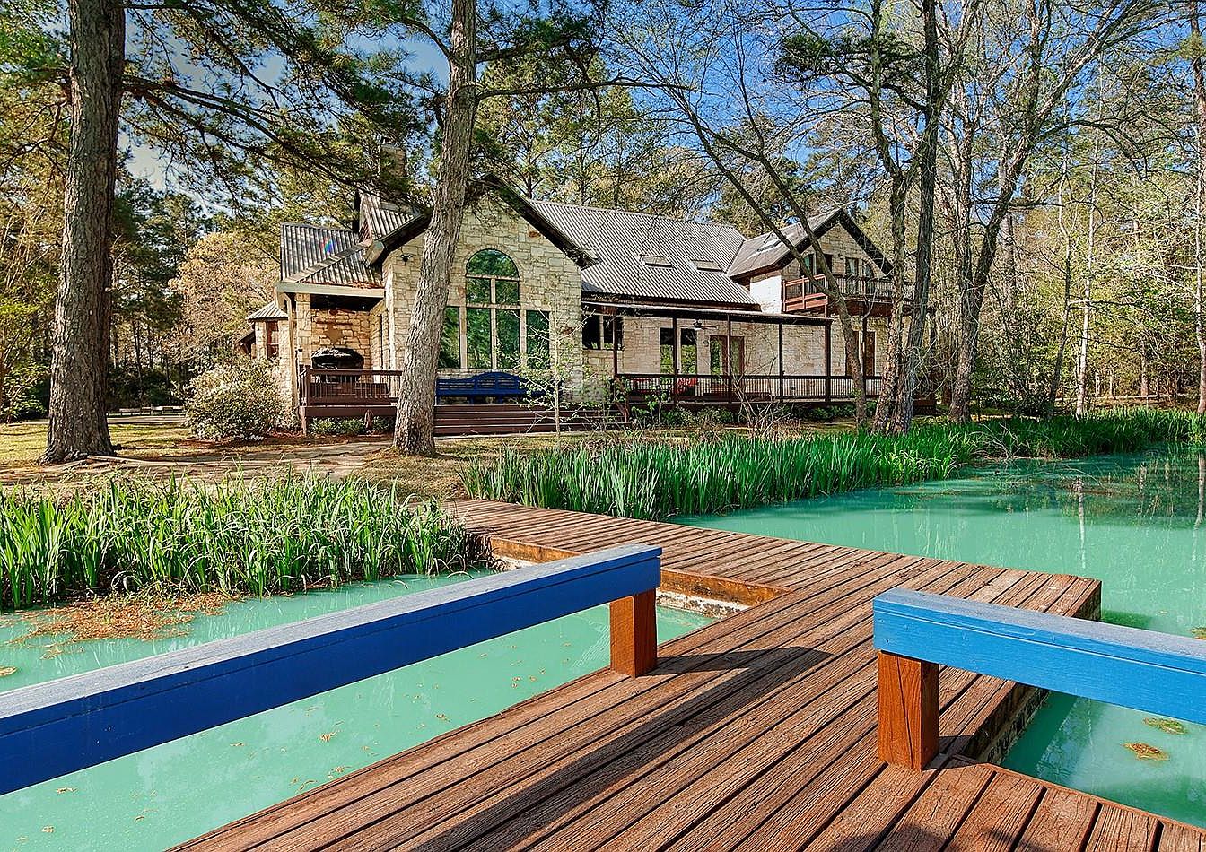 This exceptional waterfront home in Magnolia, TX, is situated on 10 fully fenced, picturesque acres within the Glenmont Estates community. Architecturally, the residence showcases a charming stone exterior complemented by a durable metal roof, embodying a rustic yet refined style with vaulted wood beam ceilings and detailed trim work. The property includes extensive covered porches and a beautifully stocked 2.5-acre pond complete with a dock and fish feeder, enhancing the tranquil outdoor living experience. The floor plan includes 4 bedrooms, 3 full baths, a private study, formal dining room, sunroom with panoramic views of the acreage and pond, and a game room upstairs. The property spans 10 acres with an agricultural exemption for honeybees, a mosquito system, and facilities that welcome horses, surrounded by walking, biking, and ATV trails. Priced at $1,490,000, this home offers luxury, privacy, and comfort, all while being located in a never-flooded area.