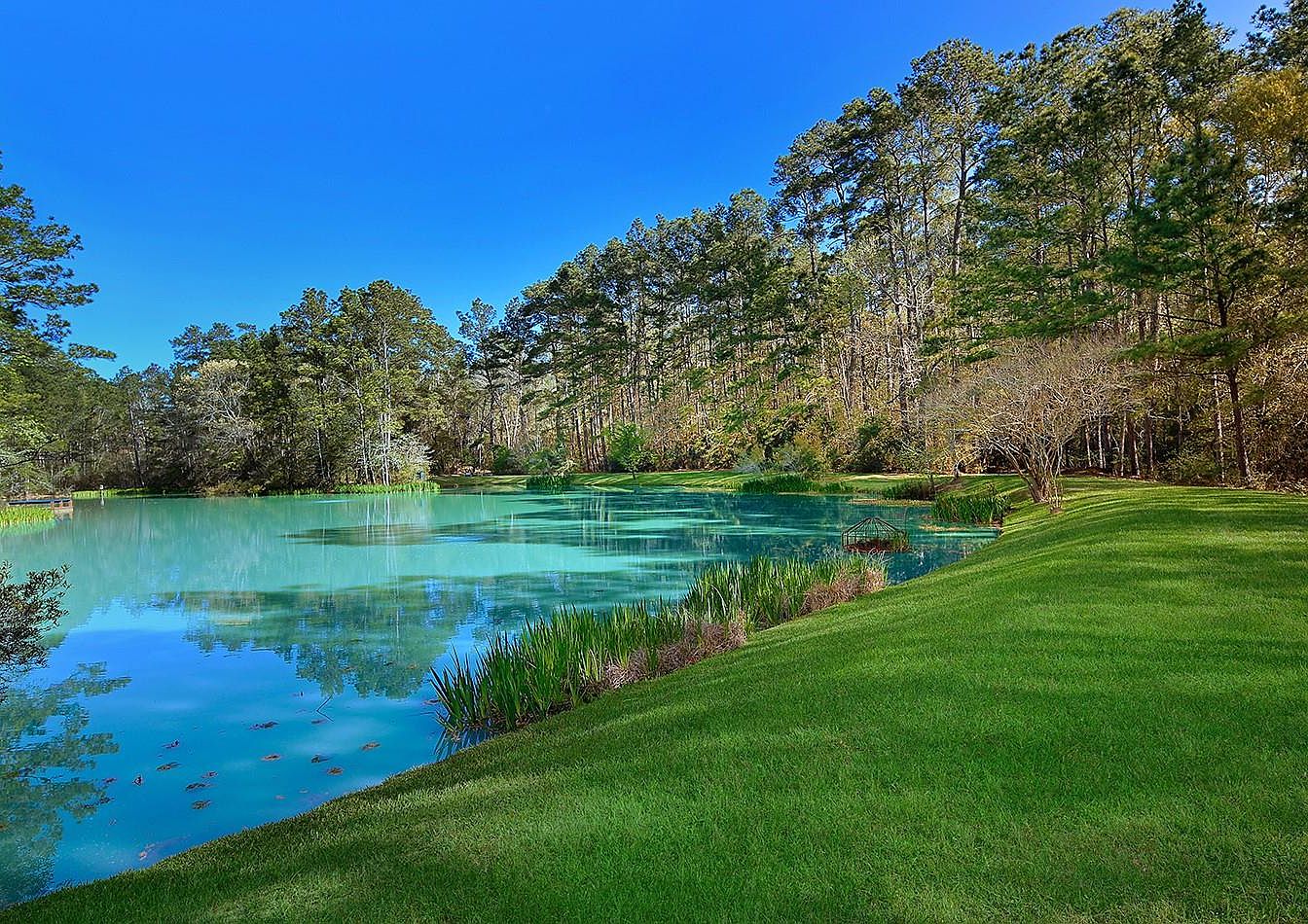 This outdoor space features a gently sloping, lush green lawn that leads to a serene, turquoise pond bordered by tall grasses and natural vegetation. The pond’s clear water reflects the surrounding tall trees, predominantly evergreens and deciduous varieties, creating a picturesque, tranquil setting. The sky is bright blue, adding to the scene’s vibrant, fresh atmosphere. The carefully maintained grass and natural water body blend landscaping with nature, offering potential for peaceful relaxation or outdoor gatherings in a private, wooded environment. It’s an inviting backyard ideal for nature lovers and outdoor enjoyment.
