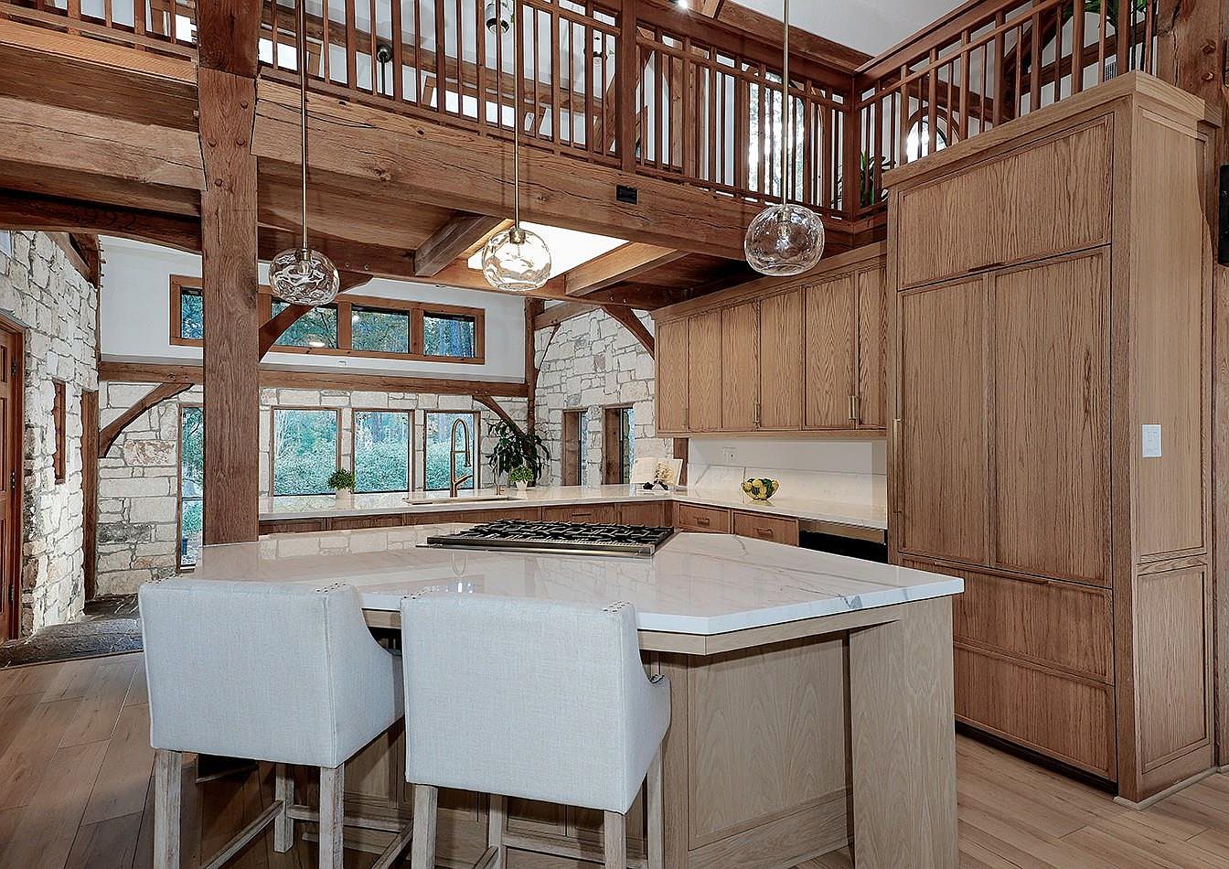 This kitchen area features a large island with a sleek white marble countertop and built-in gas cooktop, perfect for meal preparation and casual dining with two light gray upholstered bar stools. Surrounding cabinetry and the island base showcase natural wood grain that complements the exposed timber beams and railings above, which create a rustic yet refined loft-like feel. The open upper balcony overlooks the kitchen space, emphasizing the high ceiling and architectural wood framework. Stone walls and multiple windows bring natural textures and light, balancing warmth and modern elegance in the design.