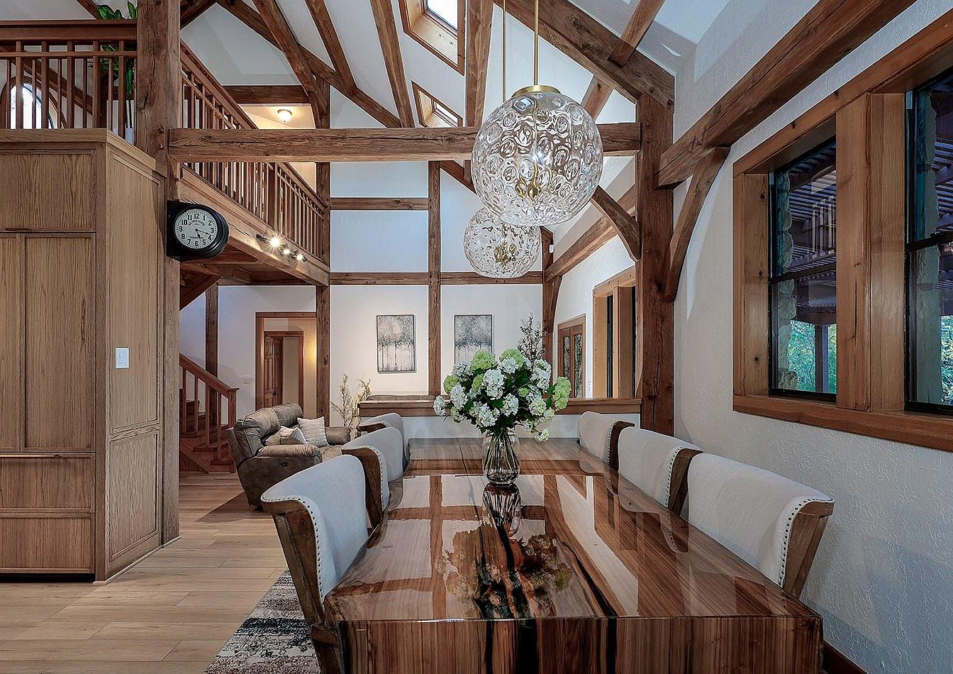 This dining space features a striking high vaulted ceiling framed with exposed wooden beams, creating a warm and rustic yet sophisticated atmosphere. The centerpiece is a large, polished wooden dining table with a glossy finish that reflects the soft light from two large, globe pendant lights with intricate bubble designs. Around the table, cushioned chairs with light upholstery and dark wooden accents add comfort and elegance. Natural light flows through substantial windows framed by rich wood, matching the wooden stair railing and cabinetry. Neutral walls and minimal artwork complete the harmonious, inviting setting.