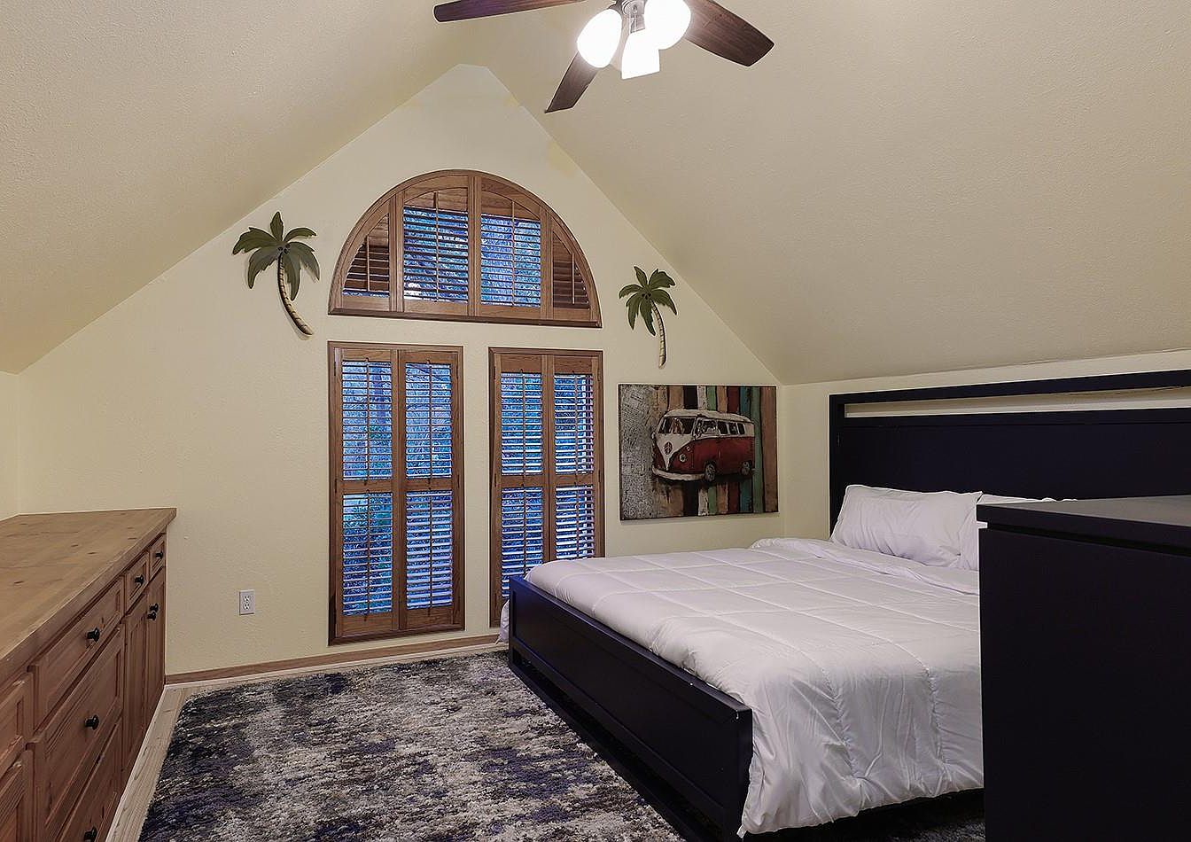 This cozy bedroom features a unique vaulted ceiling with an arched window complemented by three rectangular wooden shutter panels below, allowing filtered natural light while ensuring privacy. The wall decoration includes two small palm tree accents that add a playful, tropical touch, balanced by a vintage style painting of a red camper van, introducing a pop of color and personality. A large dresser with a natural wood finish runs along one side, contrasting the dark-framed bed with crisp white bedding. The floor is covered by a textured area rug that adds softness and warmth to the neutral-toned room.